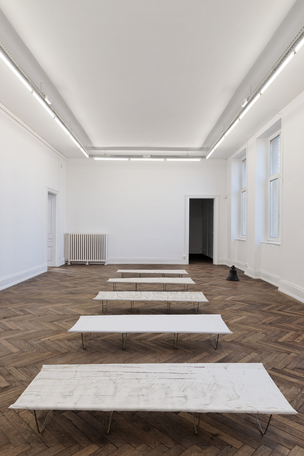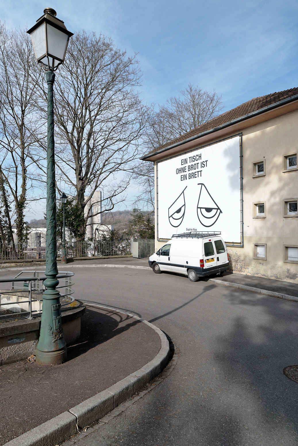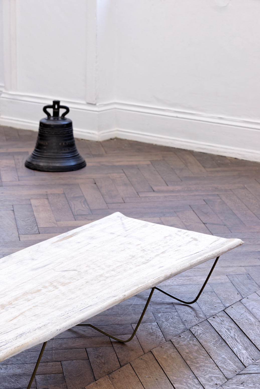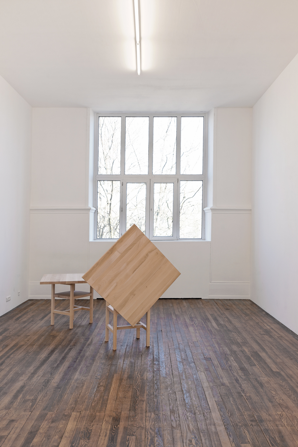 Ein Tisch ohne Brot ist ein Brett, ein Tisch ohne Brot ist ein Brett, ein Tisch ohne Brot ist ein Brett, ein Tisch ohne Brot ist ein Brett… here I am endlessly repeating this sentence which is the title of this solo show of Sophie Nys, as if the better to grasp its mechanics and substance. For this statement, which not only acts as an image, informs both the challenges of Sophie Nys’ work in general and the preoccupations at work in this exhibition in particular. Ein Tisch ohne Brot ist ein Brett, which literally means “a table without bread is a board”, is the adaptation of a Russian saying which deals with both the object in its simplest material apparatus and the history it raises. Ein Tisch ohne Brot ist ein Brett, and, you see, the words are pleasant to utter, is therefore this relentless conceptual game, at once economical and rudimentary, which addresses a whole swathe of history, that of bread and its absence, and by extension the history of the crises and famines that have traversed Europe.
