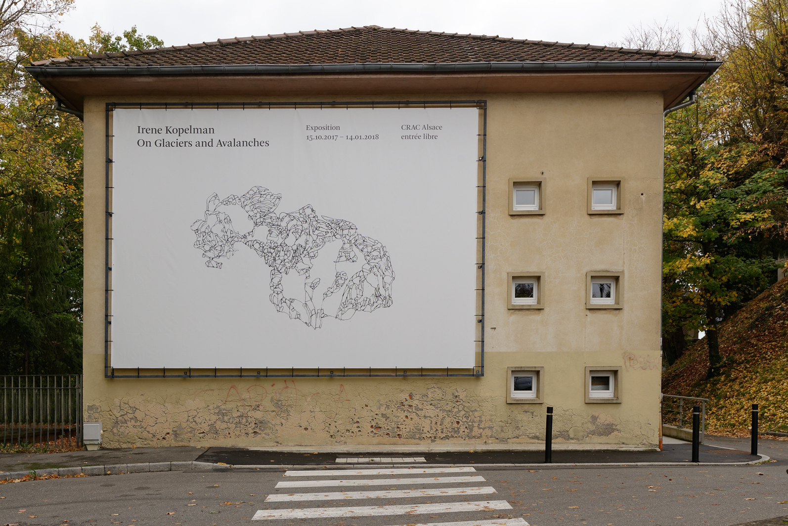 On Glaciers and Avalanches réunit des travaux issus d’expéditions menées sur les glaciers entre 2012 et 2014, ainsi que des dessins réalisés cet été, avec la collaboration de l’Institut Kunst de Bâle, afin de compléter la recherche. Plusieurs séries de dessins, d’aquarelles et de peintures se déploient sur les murs du CRAC Alsace, complétées par une nouvelle série de sculptures en porcelaine disposées au sol à divers endroits du centre d’art, ainsi que différents objets et documents provenant directement des expéditions scientifiques.