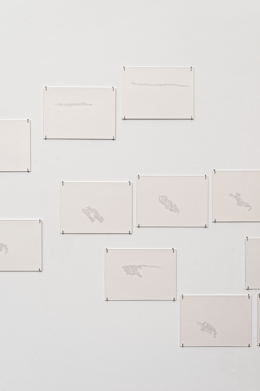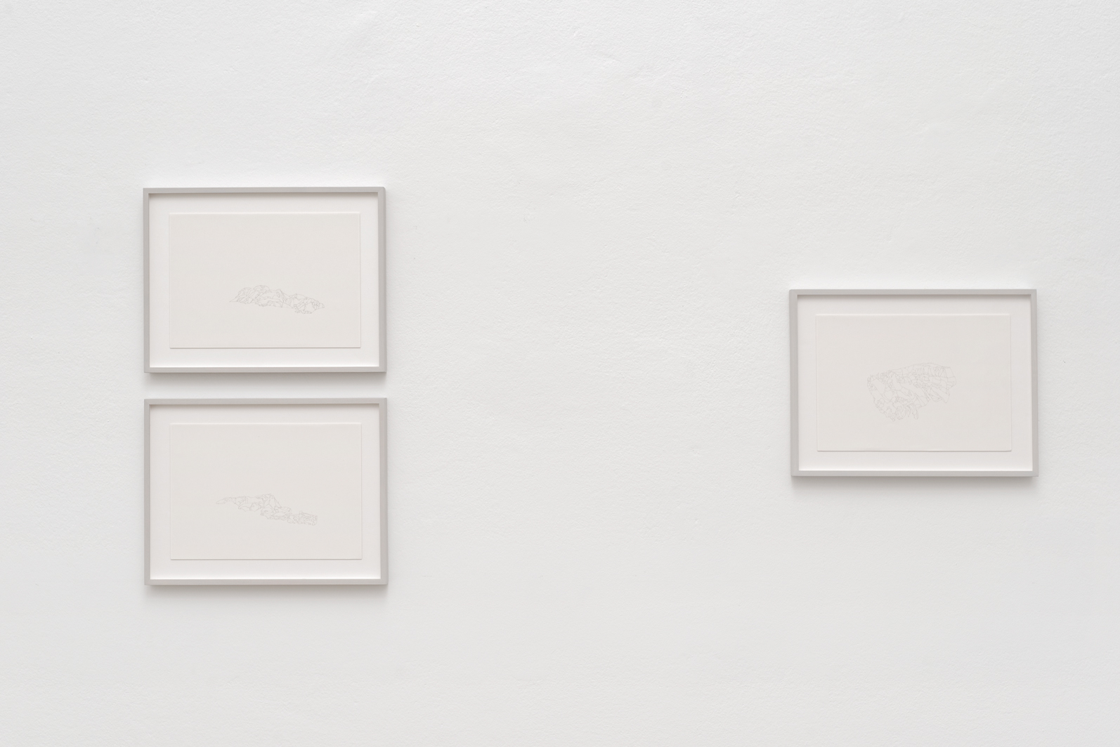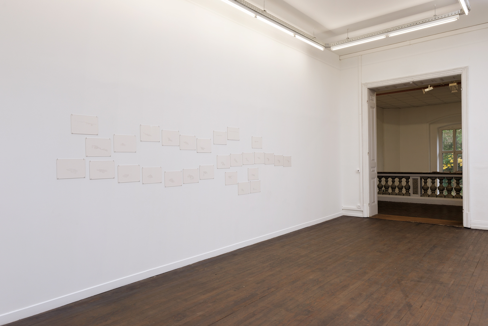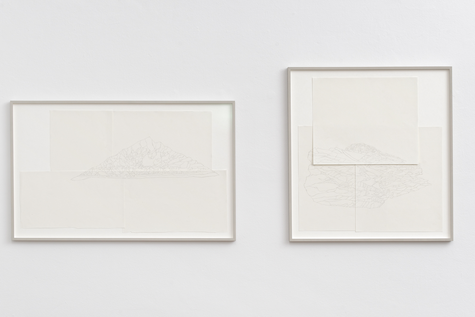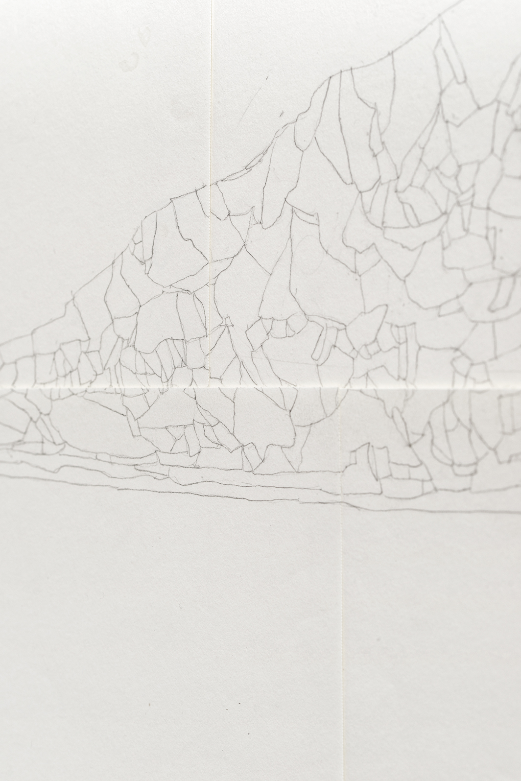 Et évidemment le glacier. En plus de la série de quatre dessins View of Grosser Aletschgletscher (2013), dans laquelle différentes tonalités de blancs, de bruns et de noirs offrent des vues distinctes dudit glacier, plusieurs séries représentant des fragments de différents glaciers se déploient dans l’espace, répartissant et situant divers points géographiques alpins dans les différentes salles. Dans l’espace central au 1er étage du CRAC, Gornergletscher from On Top (2014), une installation de 28 dessins, montre le glacier dans sa totalité à travers différents fragments dessinés et les vides entre eux. Pendant dix jours, l’artiste dessine les zones du glacier présentant la plus grande variété de formes et de textures, laissant de côté les endroits où la surface de la glace est lisse. Elle établit ainsi une méthodologie arbitraire qui lui permet d’appréhender et de délimiter le paysage. Cette pièce sert à réaliser la nouvelle série de sculptures en céramique. Superposant la forme du glacier avec le plan au sol du CRAC, nous avons sélectionné quelques-uns des dessins qui, matérialisés désormais en volume, sont disséminés à travers les différentes salles, posés au sol à chaque point de convergence.