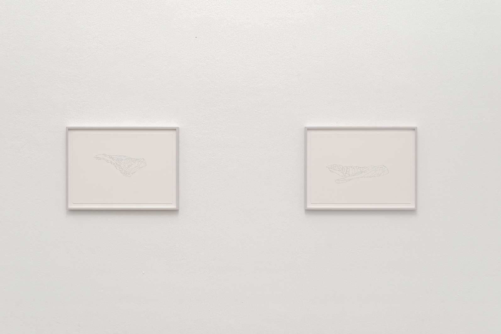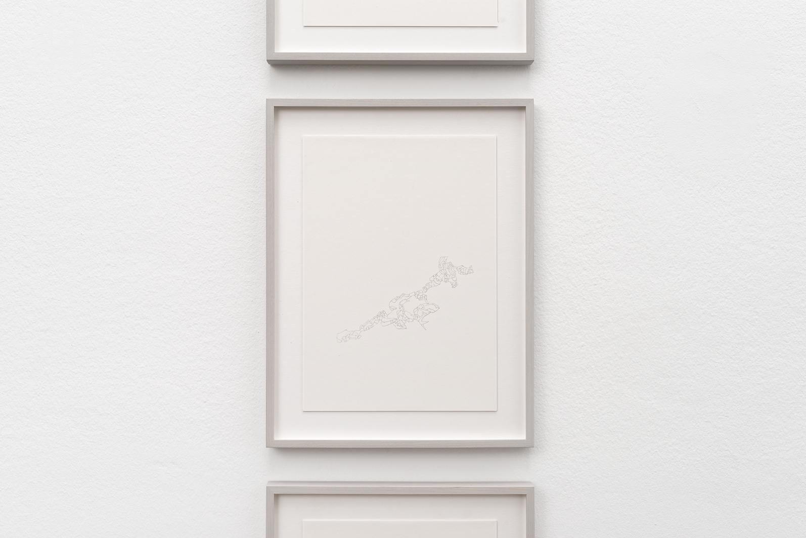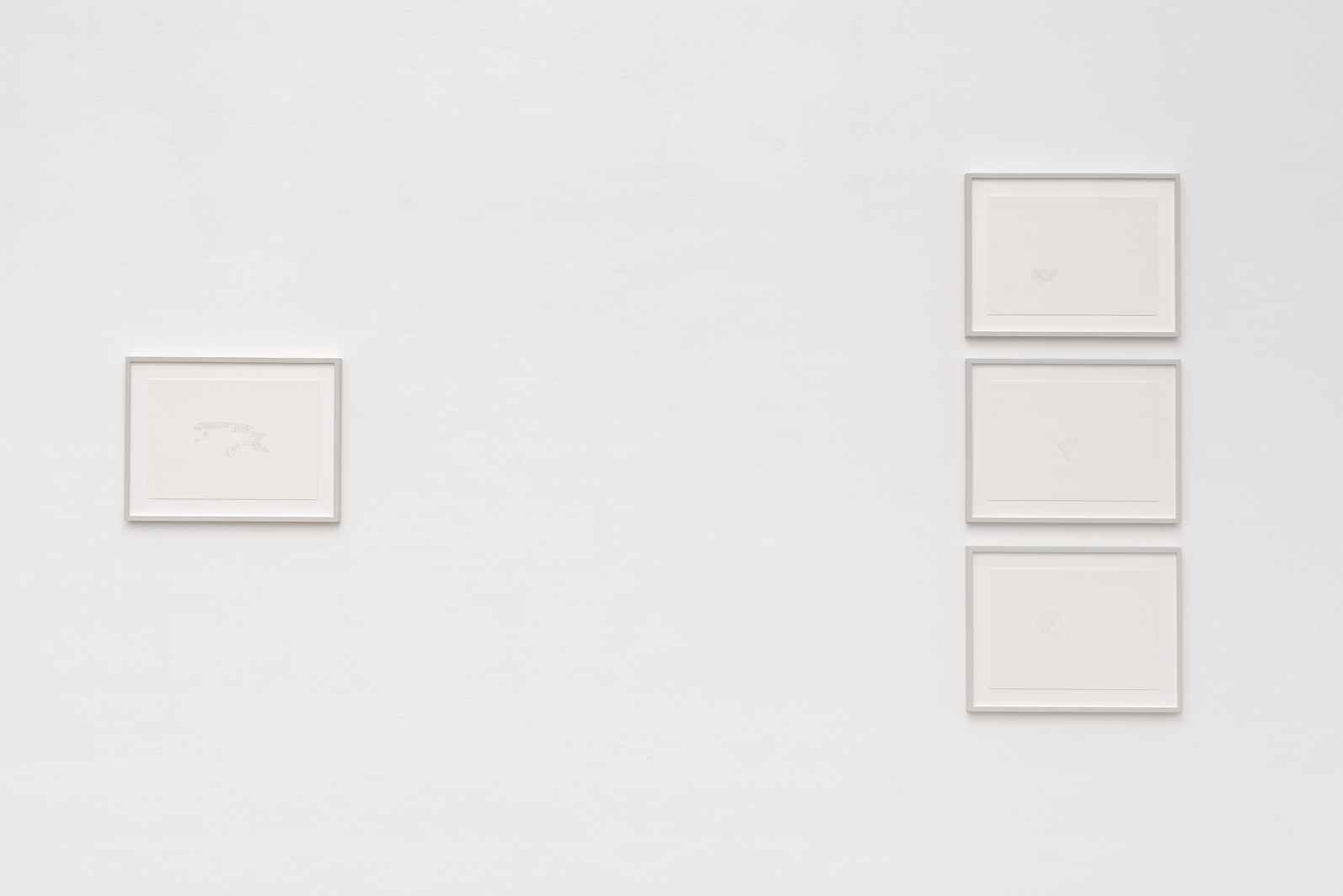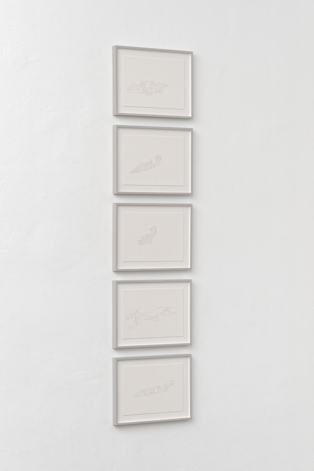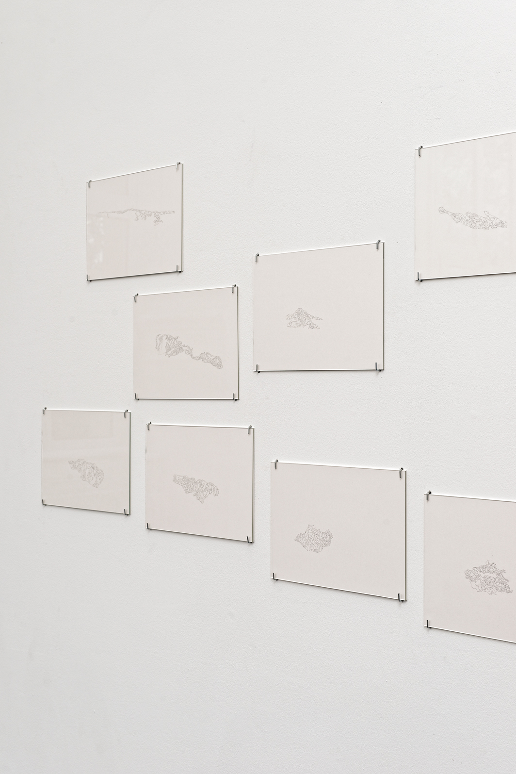 Et évidemment le glacier. En plus de la série de quatre dessins View of Grosser Aletschgletscher (2013), dans laquelle différentes tonalités de blancs, de bruns et de noirs offrent des vues distinctes dudit glacier, plusieurs séries représentant des fragments de différents glaciers se déploient dans l’espace, répartissant et situant divers points géographiques alpins dans les différentes salles. Dans l’espace central au 1er étage du CRAC, Gornergletscher from On Top (2014), une installation de 28 dessins, montre le glacier dans sa totalité à travers différents fragments dessinés et les vides entre eux. Pendant dix jours, l’artiste dessine les zones du glacier présentant la plus grande variété de formes et de textures, laissant de côté les endroits où la surface de la glace est lisse. Elle établit ainsi une méthodologie arbitraire qui lui permet d’appréhender et de délimiter le paysage. Cette pièce sert à réaliser la nouvelle série de sculptures en céramique. Superposant la forme du glacier avec le plan au sol du CRAC, nous avons sélectionné quelques-uns des dessins qui, matérialisés désormais en volume, sont disséminés à travers les différentes salles, posés au sol à chaque point de convergence.