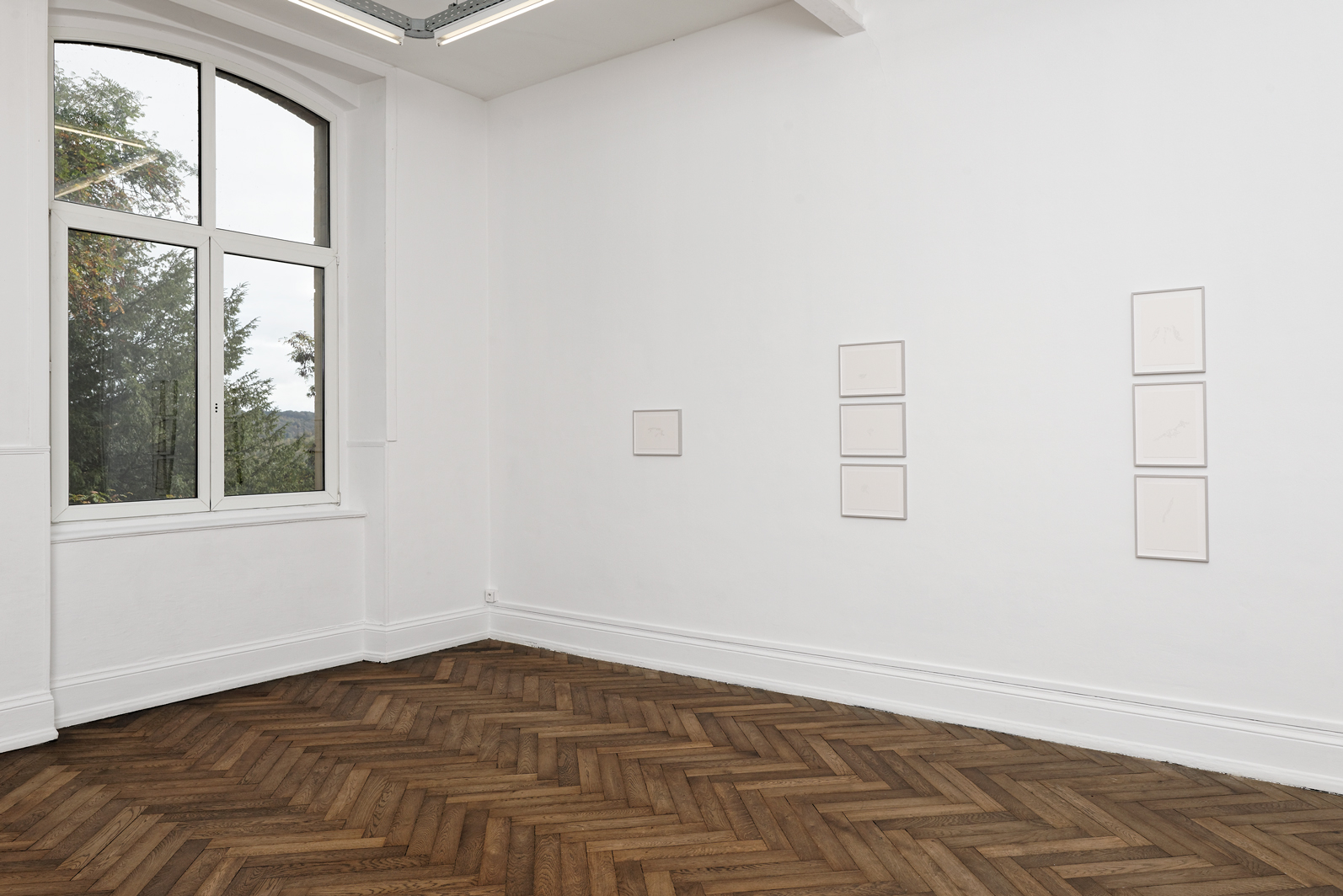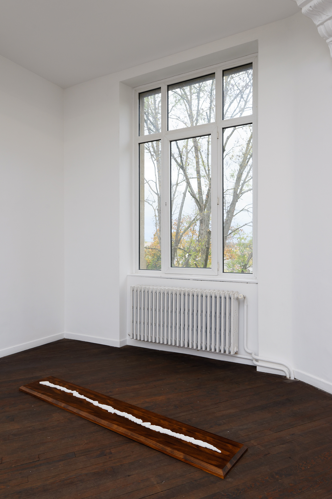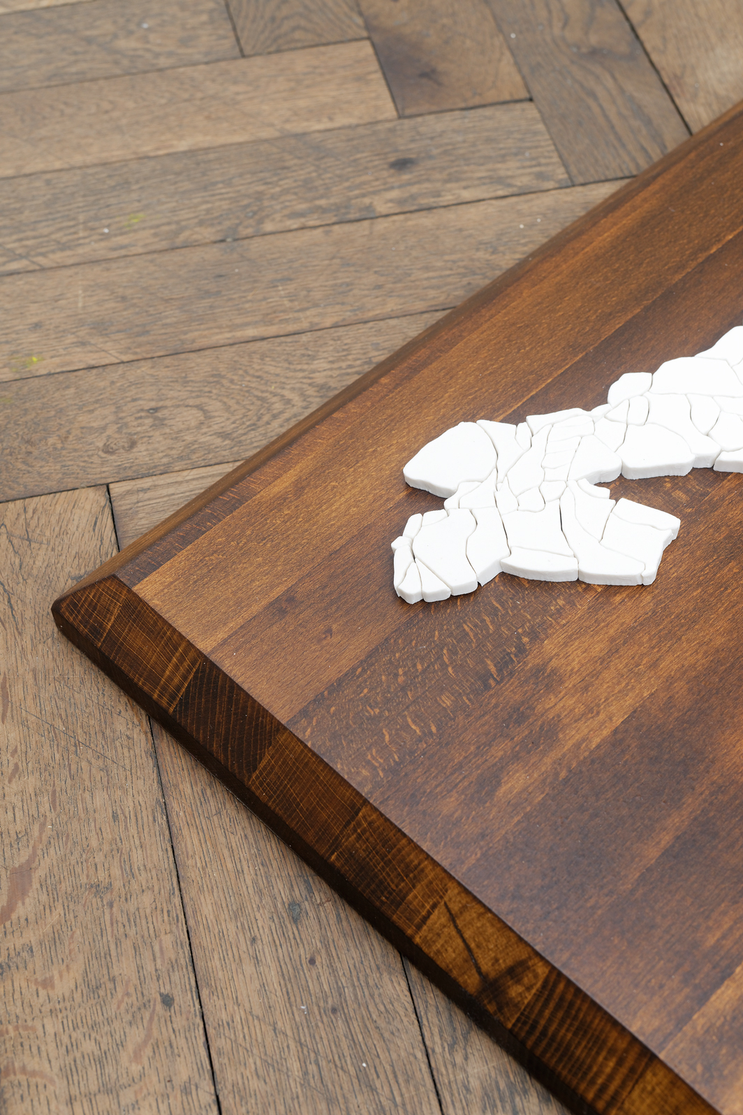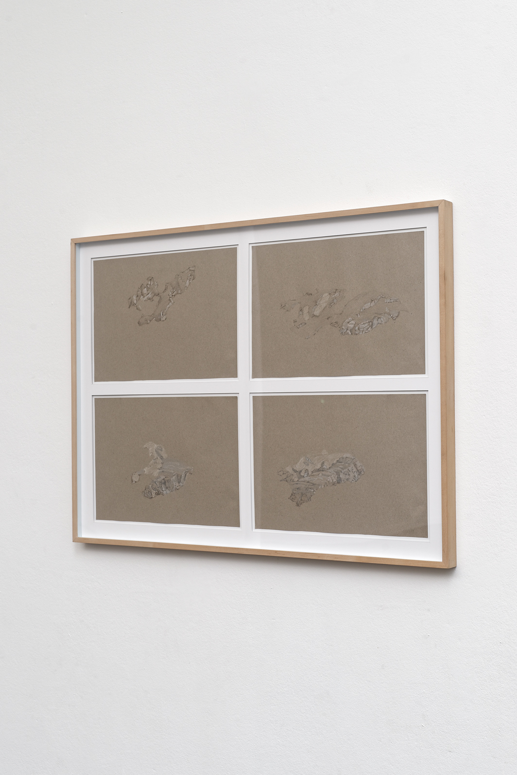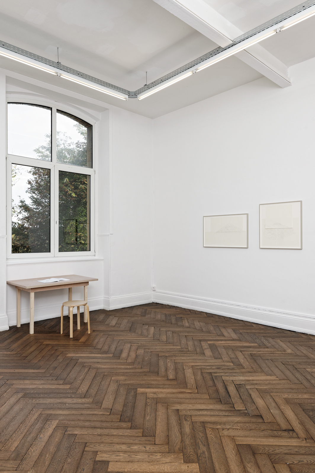 Et évidemment le glacier. En plus de la série de quatre dessins View of Grosser Aletschgletscher (2013), dans laquelle différentes tonalités de blancs, de bruns et de noirs offrent des vues distinctes dudit glacier, plusieurs séries représentant des fragments de différents glaciers se déploient dans l’espace, répartissant et situant divers points géographiques alpins dans les différentes salles. Dans l’espace central au 1er étage du CRAC, Gornergletscher from On Top (2014), une installation de 28 dessins, montre le glacier dans sa totalité à travers différents fragments dessinés et les vides entre eux. Pendant dix jours, l’artiste dessine les zones du glacier présentant la plus grande variété de formes et de textures, laissant de côté les endroits où la surface de la glace est lisse. Elle établit ainsi une méthodologie arbitraire qui lui permet d’appréhender et de délimiter le paysage. Cette pièce sert à réaliser la nouvelle série de sculptures en céramique. Superposant la forme du glacier avec le plan au sol du CRAC, nous avons sélectionné quelques-uns des dessins qui, matérialisés désormais en volume, sont disséminés à travers les différentes salles, posés au sol à chaque point de convergence.