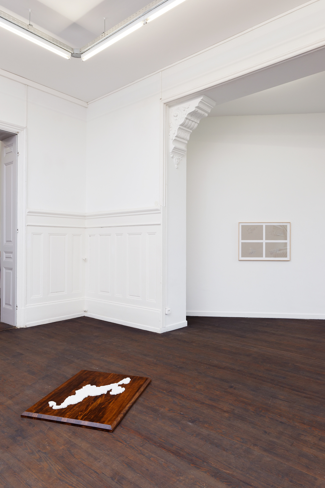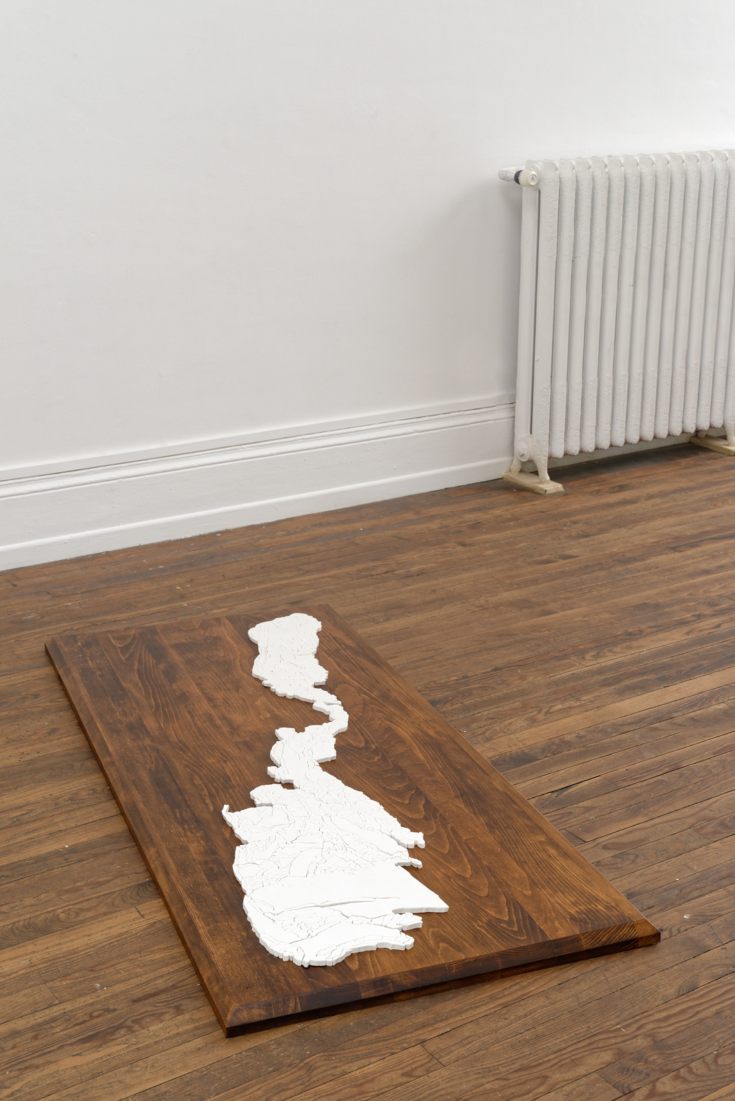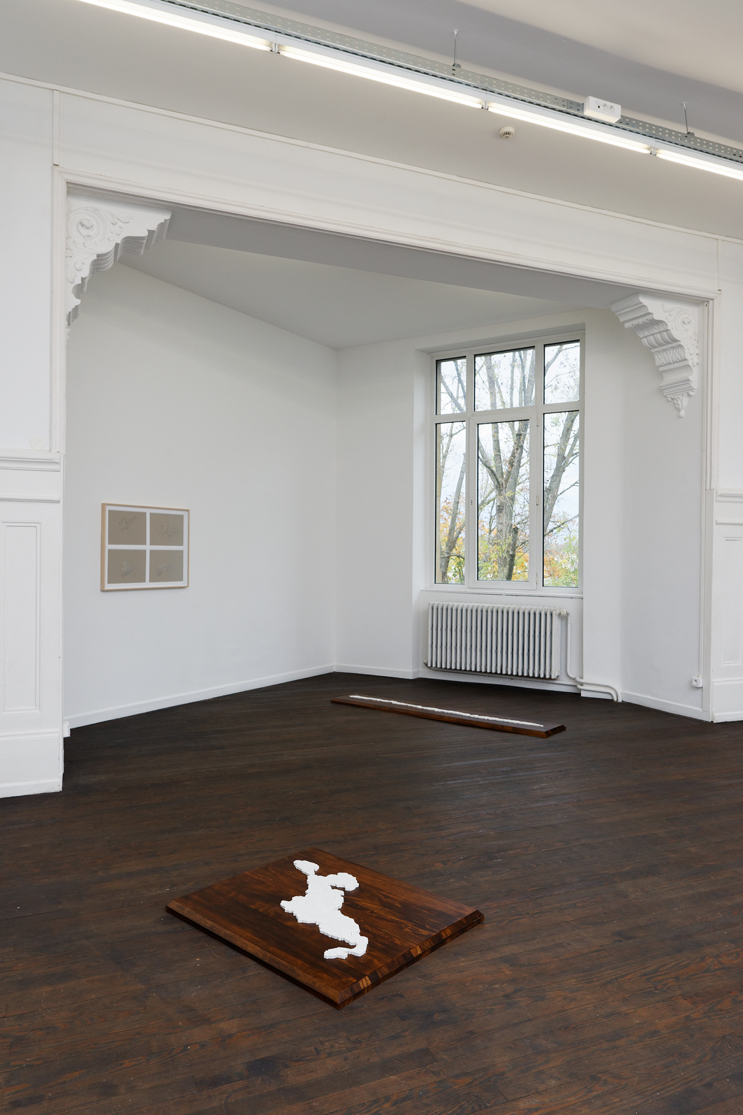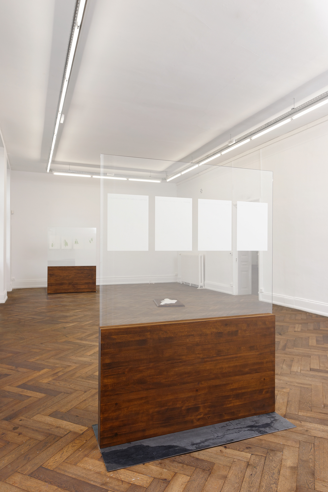 Et évidemment le glacier. En plus de la série de quatre dessins View of Grosser Aletschgletscher (2013), dans laquelle différentes tonalités de blancs, de bruns et de noirs offrent des vues distinctes dudit glacier, plusieurs séries représentant des fragments de différents glaciers se déploient dans l’espace, répartissant et situant divers points géographiques alpins dans les différentes salles. Dans l’espace central au 1er étage du CRAC, Gornergletscher from On Top (2014), une installation de 28 dessins, montre le glacier dans sa totalité à travers différents fragments dessinés et les vides entre eux. Pendant dix jours, l’artiste dessine les zones du glacier présentant la plus grande variété de formes et de textures, laissant de côté les endroits où la surface de la glace est lisse. Elle établit ainsi une méthodologie arbitraire qui lui permet d’appréhender et de délimiter le paysage. Cette pièce sert à réaliser la nouvelle série de sculptures en céramique. Superposant la forme du glacier avec le plan au sol du CRAC, nous avons sélectionné quelques-uns des dessins qui, matérialisés désormais en volume, sont disséminés à travers les différentes salles, posés au sol à chaque point de convergence.