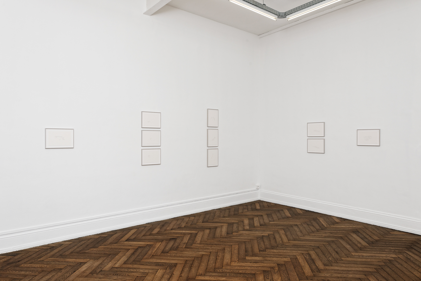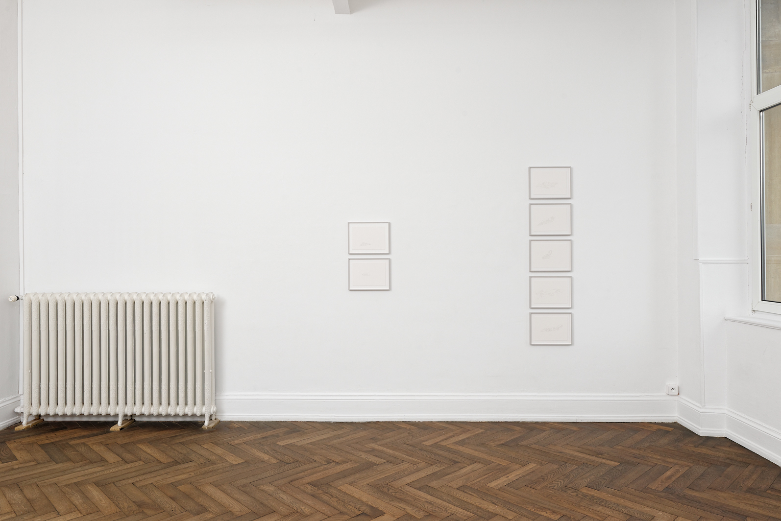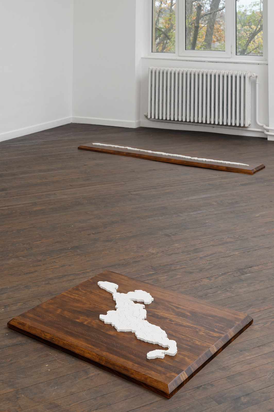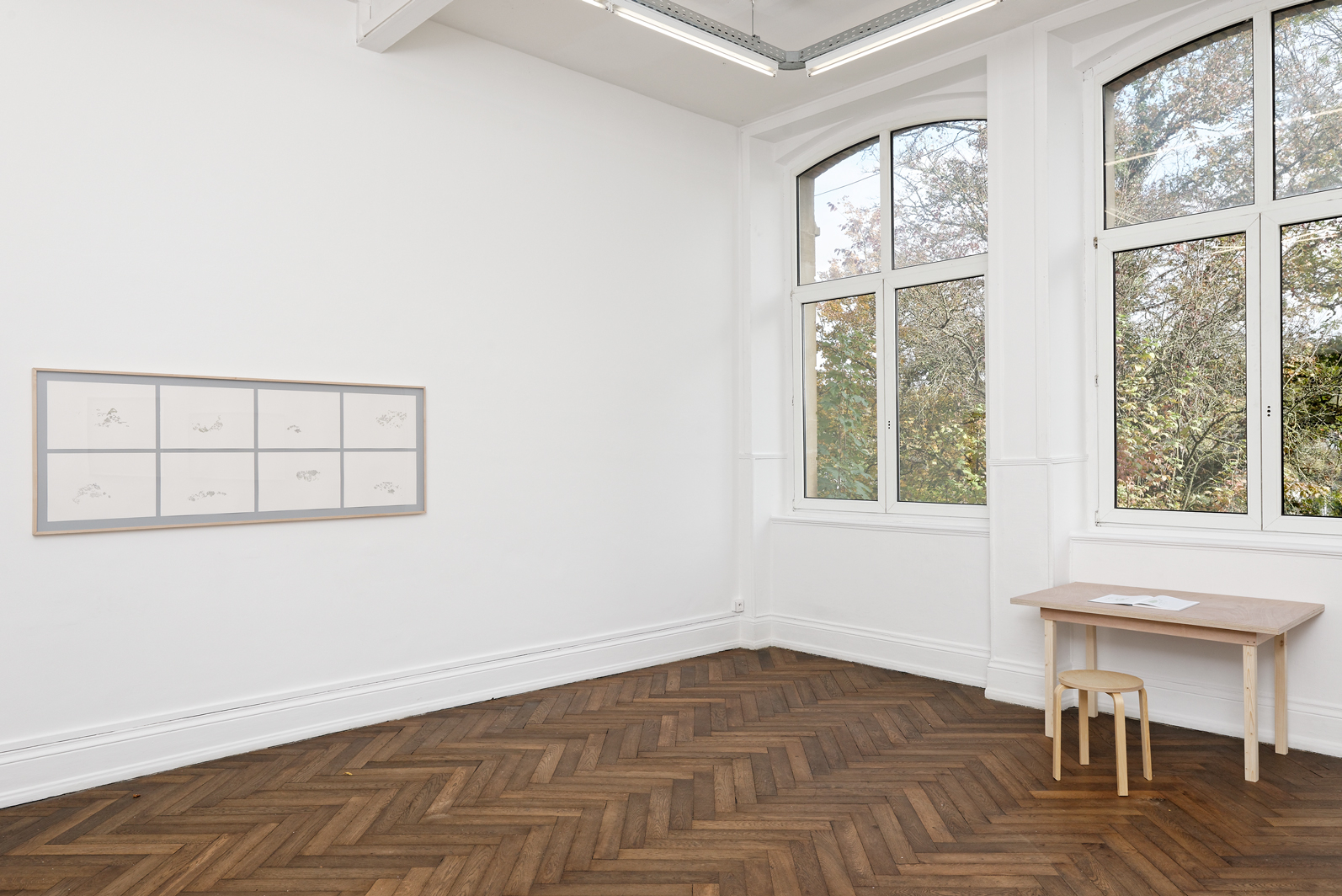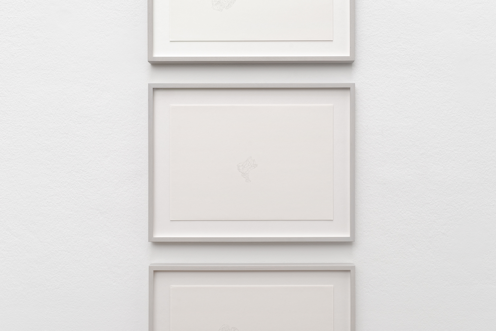 Et évidemment le glacier. En plus de la série de quatre dessins View of Grosser Aletschgletscher (2013), dans laquelle différentes tonalités de blancs, de bruns et de noirs offrent des vues distinctes dudit glacier, plusieurs séries représentant des fragments de différents glaciers se déploient dans l’espace, répartissant et situant divers points géographiques alpins dans les différentes salles. Dans l’espace central au 1er étage du CRAC, Gornergletscher from On Top (2014), une installation de 28 dessins, montre le glacier dans sa totalité à travers différents fragments dessinés et les vides entre eux. Pendant dix jours, l’artiste dessine les zones du glacier présentant la plus grande variété de formes et de textures, laissant de côté les endroits où la surface de la glace est lisse. Elle établit ainsi une méthodologie arbitraire qui lui permet d’appréhender et de délimiter le paysage. Cette pièce sert à réaliser la nouvelle série de sculptures en céramique. Superposant la forme du glacier avec le plan au sol du CRAC, nous avons sélectionné quelques-uns des dessins qui, matérialisés désormais en volume, sont disséminés à travers les différentes salles, posés au sol à chaque point de convergence.