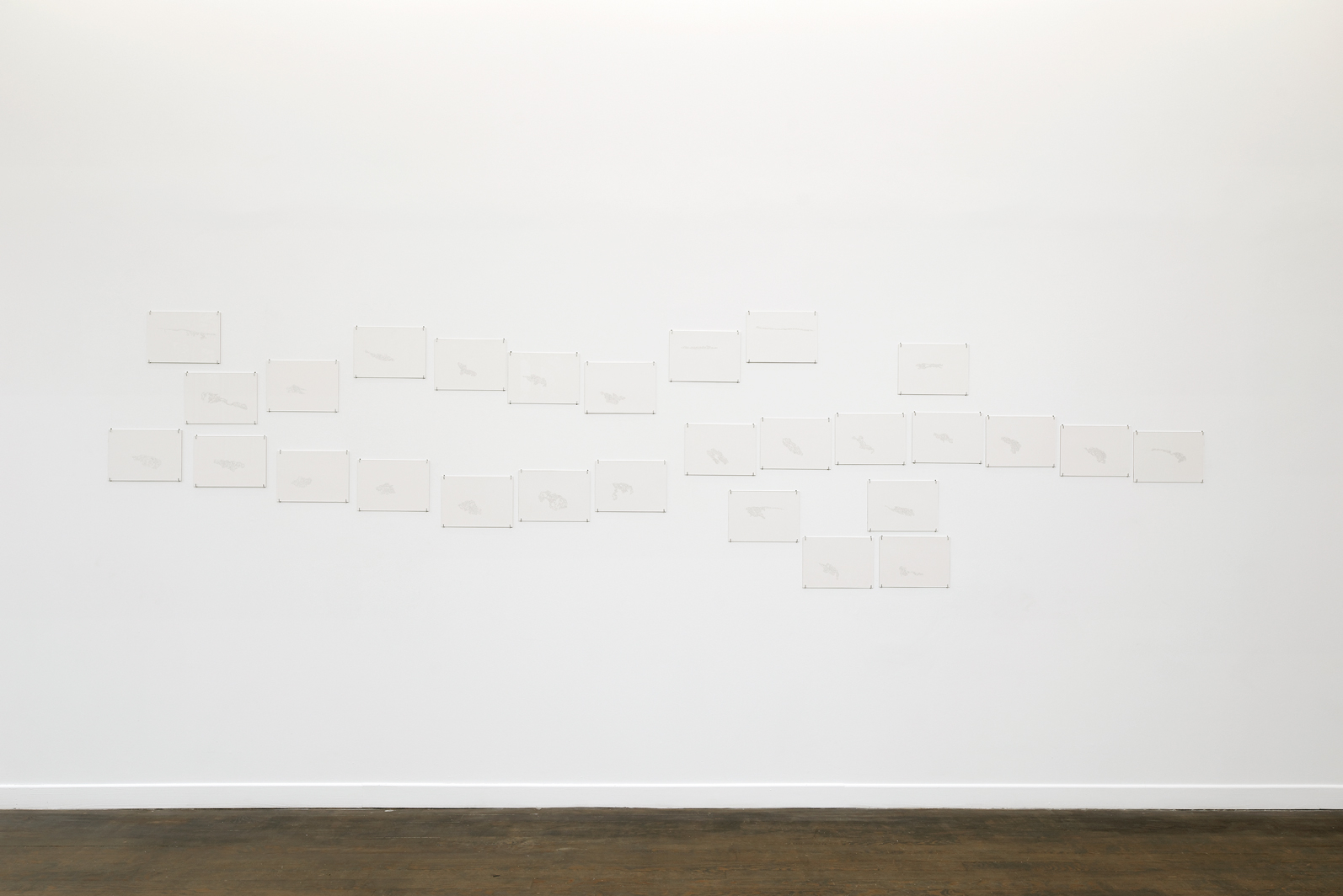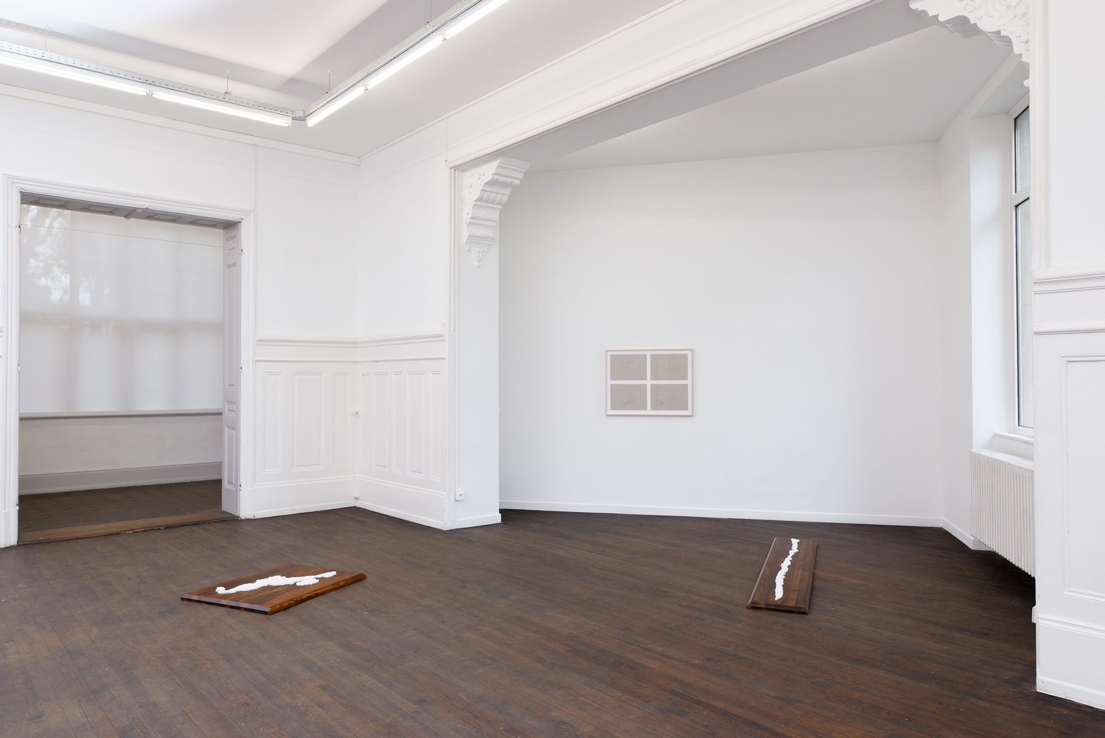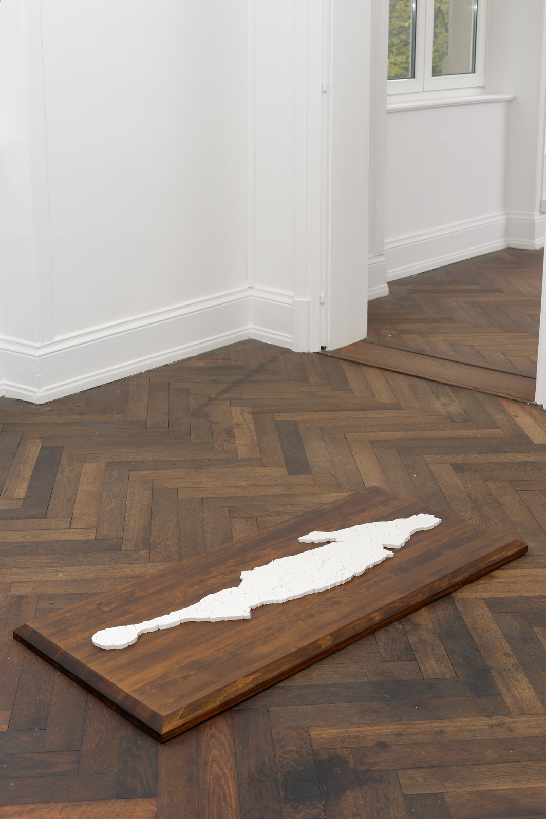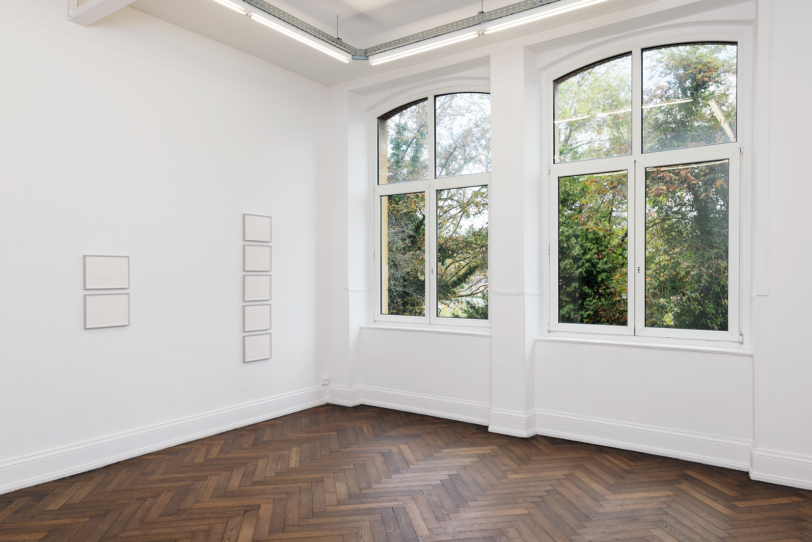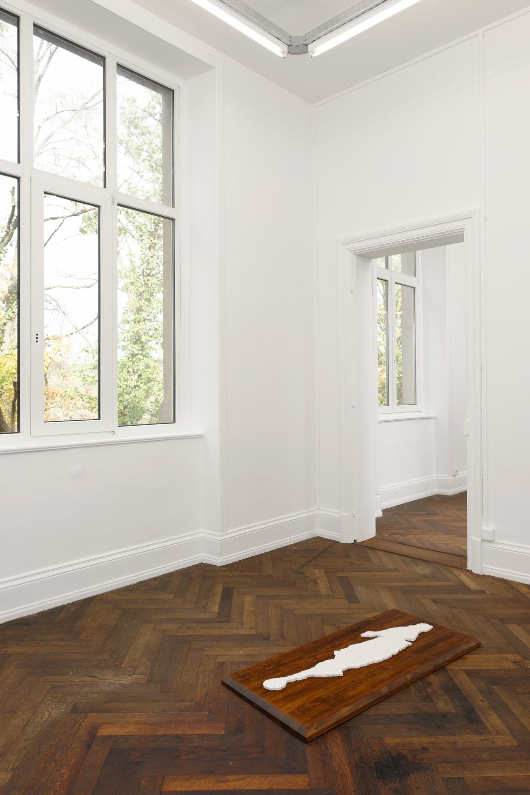 Et évidemment le glacier. En plus de la série de quatre dessins View of Grosser Aletschgletscher (2013), dans laquelle différentes tonalités de blancs, de bruns et de noirs offrent des vues distinctes dudit glacier, plusieurs séries représentant des fragments de différents glaciers se déploient dans l’espace, répartissant et situant divers points géographiques alpins dans les différentes salles. Dans l’espace central au 1er étage du CRAC, Gornergletscher from On Top (2014), une installation de 28 dessins, montre le glacier dans sa totalité à travers différents fragments dessinés et les vides entre eux. Pendant dix jours, l’artiste dessine les zones du glacier présentant la plus grande variété de formes et de textures, laissant de côté les endroits où la surface de la glace est lisse. Elle établit ainsi une méthodologie arbitraire qui lui permet d’appréhender et de délimiter le paysage. Cette pièce sert à réaliser la nouvelle série de sculptures en céramique. Superposant la forme du glacier avec le plan au sol du CRAC, nous avons sélectionné quelques-uns des dessins qui, matérialisés désormais en volume, sont disséminés à travers les différentes salles, posés au sol à chaque point de convergence.