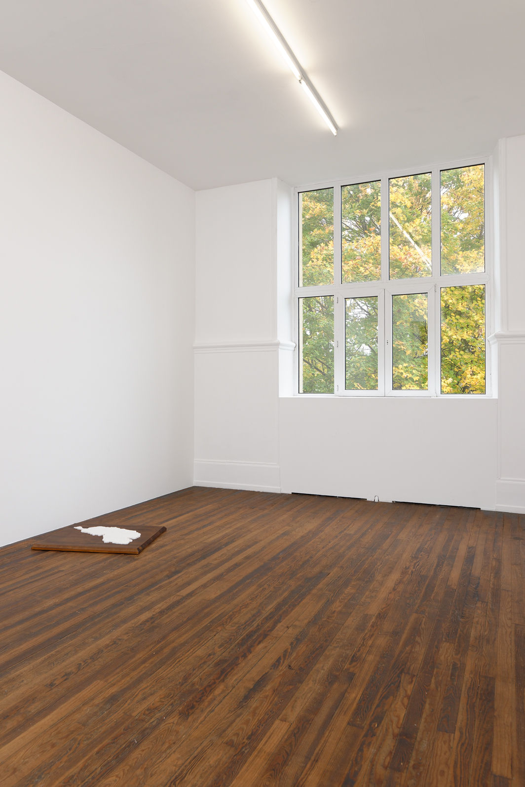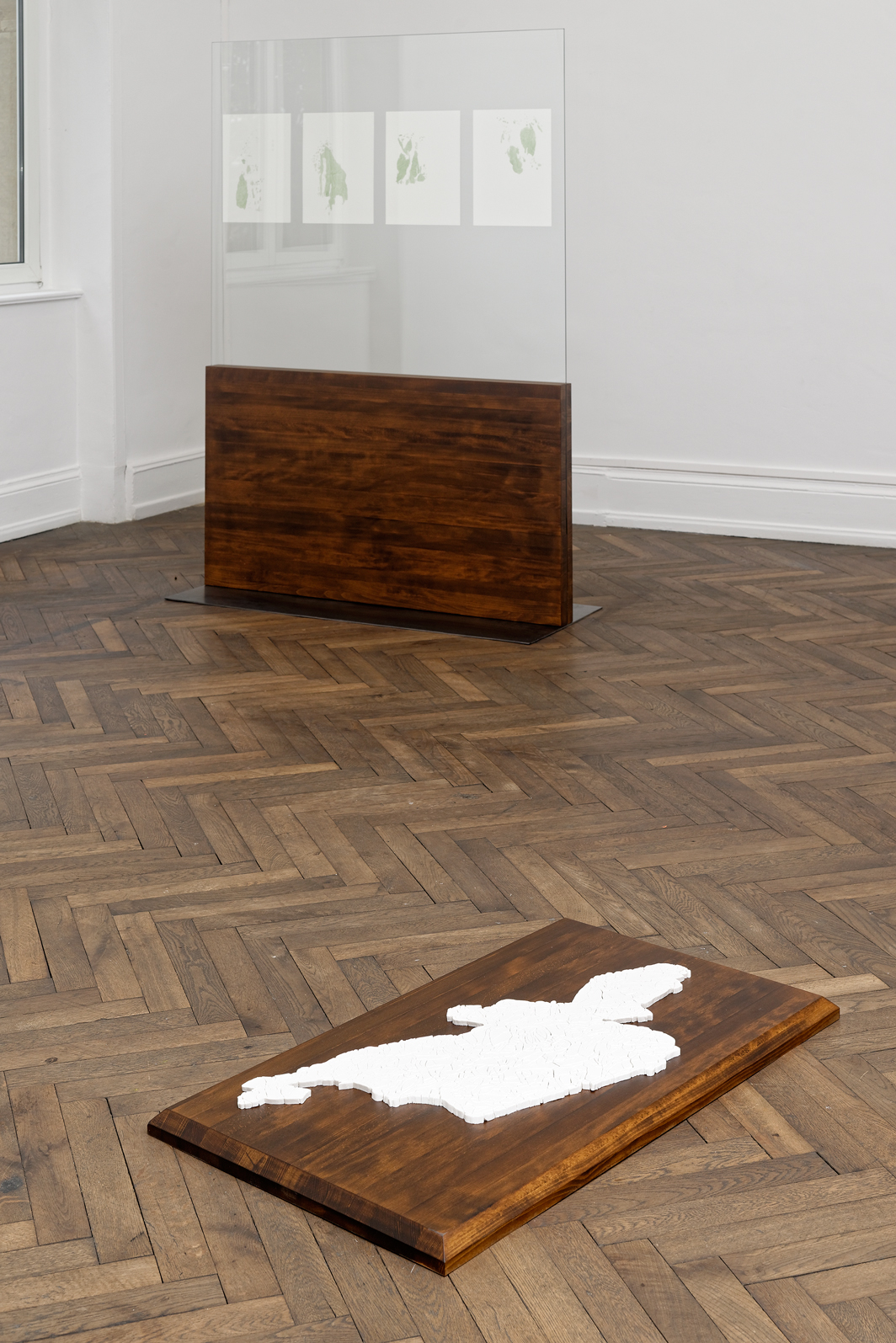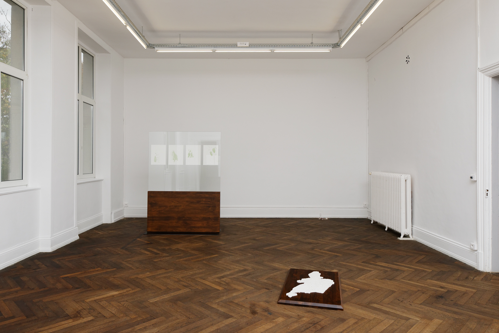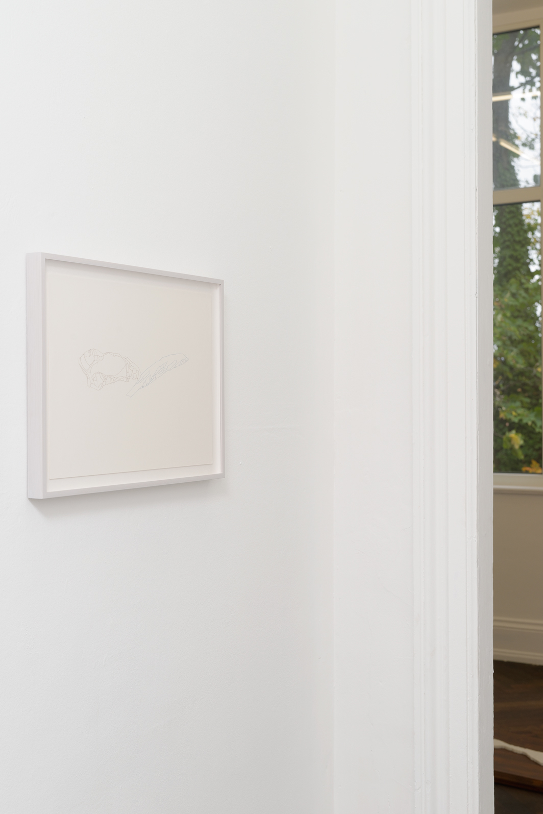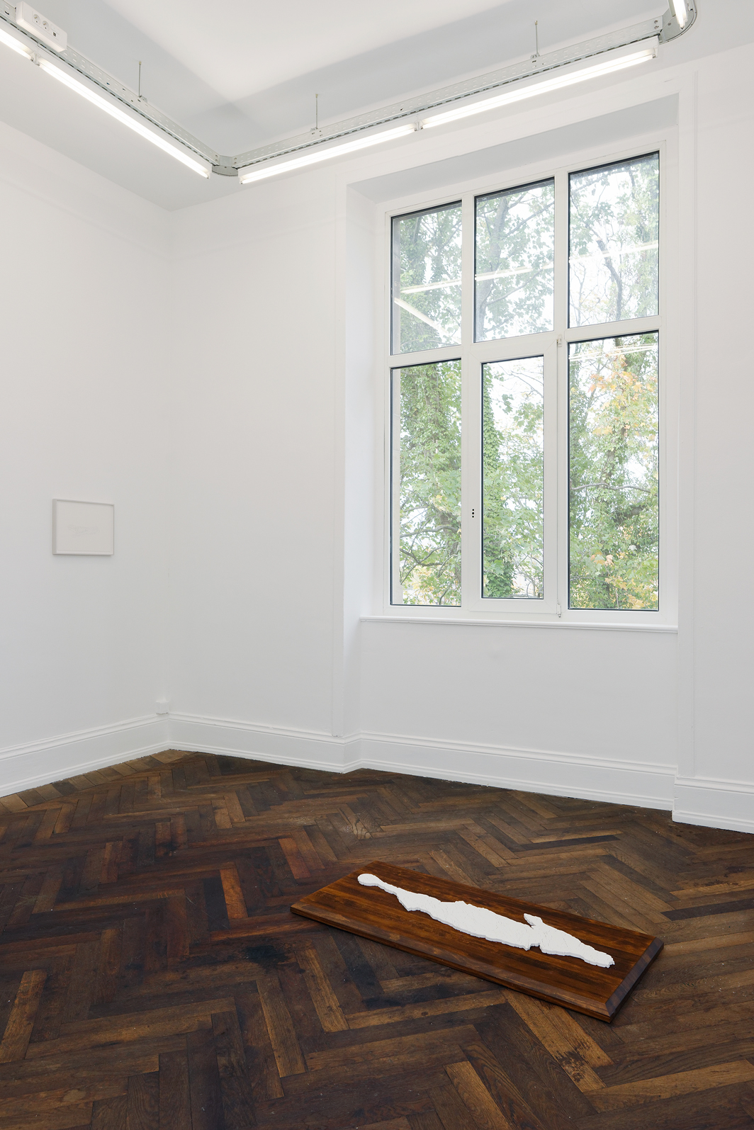 Et évidemment le glacier. En plus de la série de quatre dessins View of Grosser Aletschgletscher (2013), dans laquelle différentes tonalités de blancs, de bruns et de noirs offrent des vues distinctes dudit glacier, plusieurs séries représentant des fragments de différents glaciers se déploient dans l’espace, répartissant et situant divers points géographiques alpins dans les différentes salles. Dans l’espace central au 1er étage du CRAC, Gornergletscher from On Top (2014), une installation de 28 dessins, montre le glacier dans sa totalité à travers différents fragments dessinés et les vides entre eux. Pendant dix jours, l’artiste dessine les zones du glacier présentant la plus grande variété de formes et de textures, laissant de côté les endroits où la surface de la glace est lisse. Elle établit ainsi une méthodologie arbitraire qui lui permet d’appréhender et de délimiter le paysage. Cette pièce sert à réaliser la nouvelle série de sculptures en céramique. Superposant la forme du glacier avec le plan au sol du CRAC, nous avons sélectionné quelques-uns des dessins qui, matérialisés désormais en volume, sont disséminés à travers les différentes salles, posés au sol à chaque point de convergence.