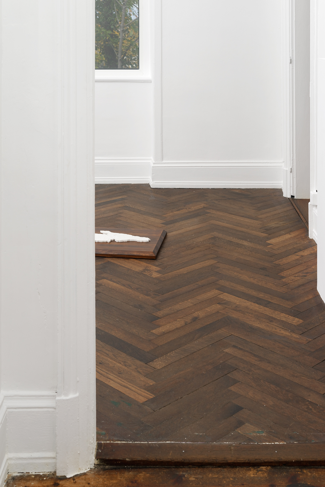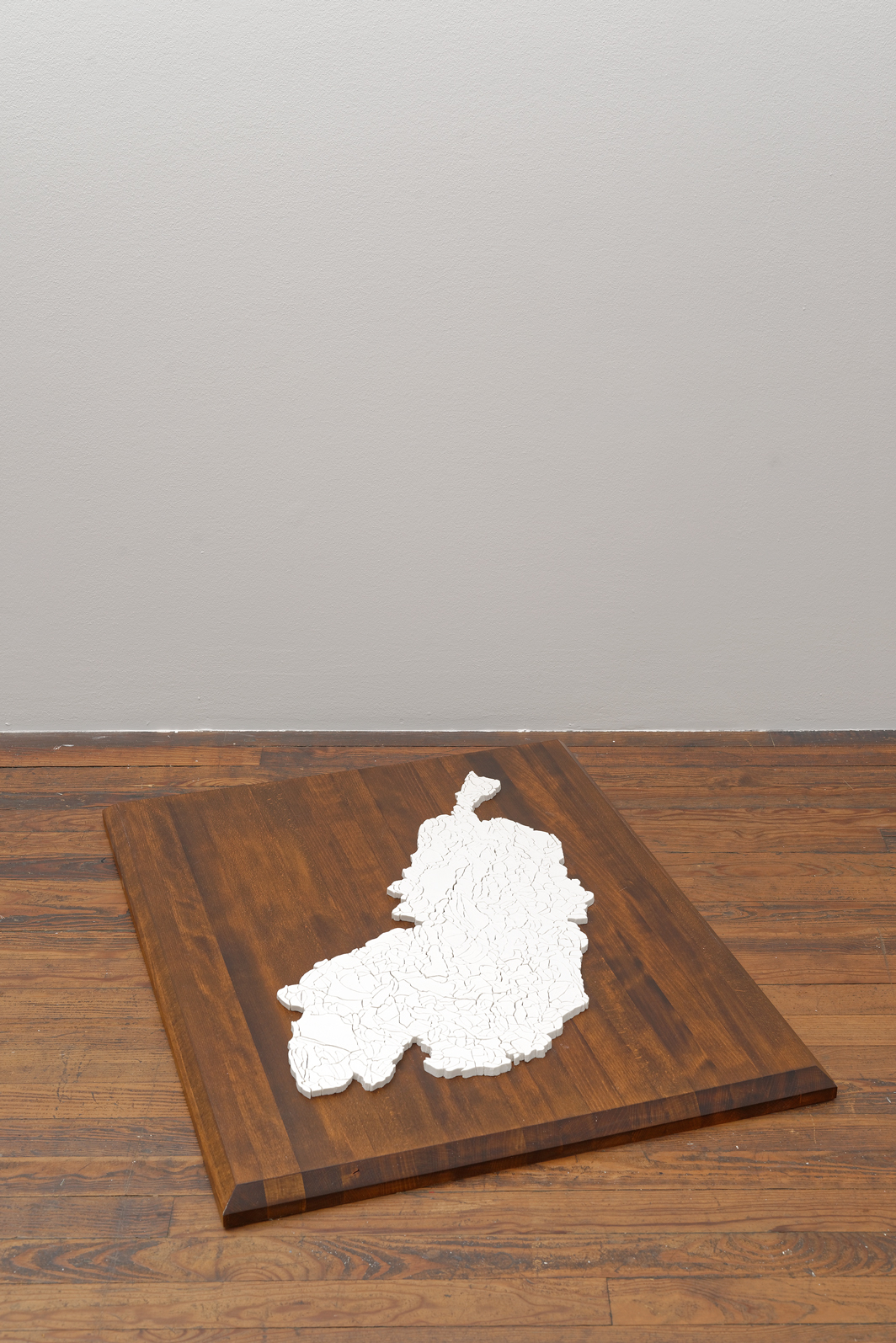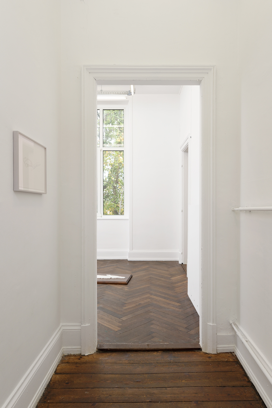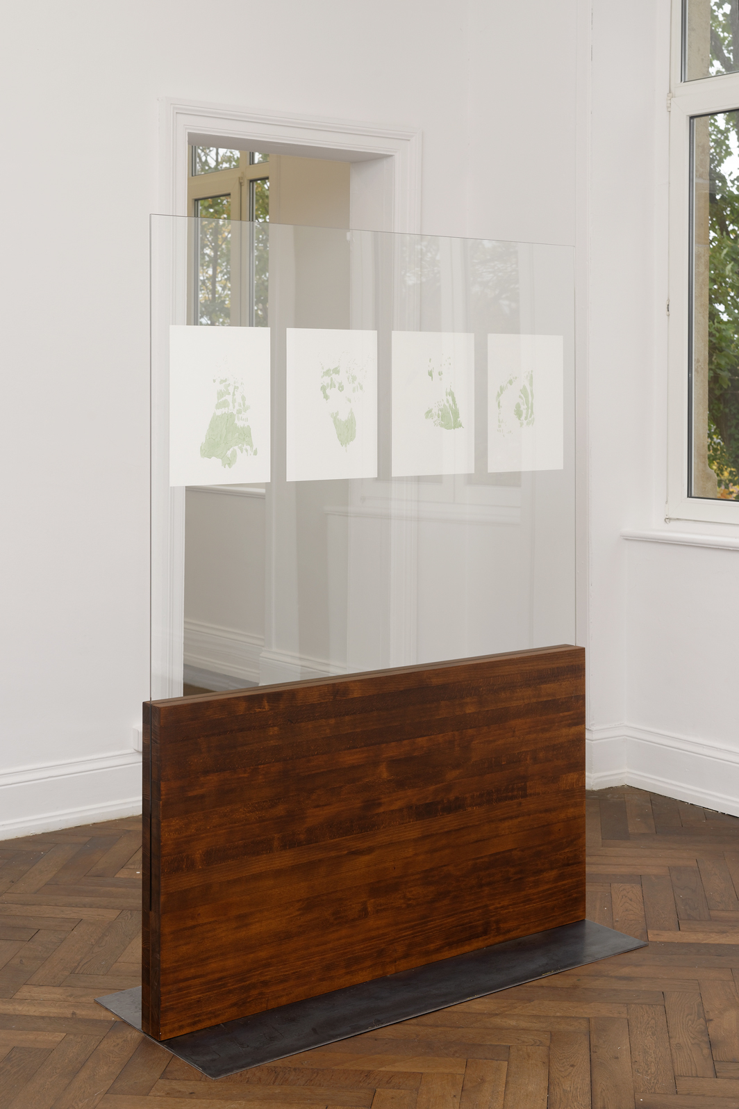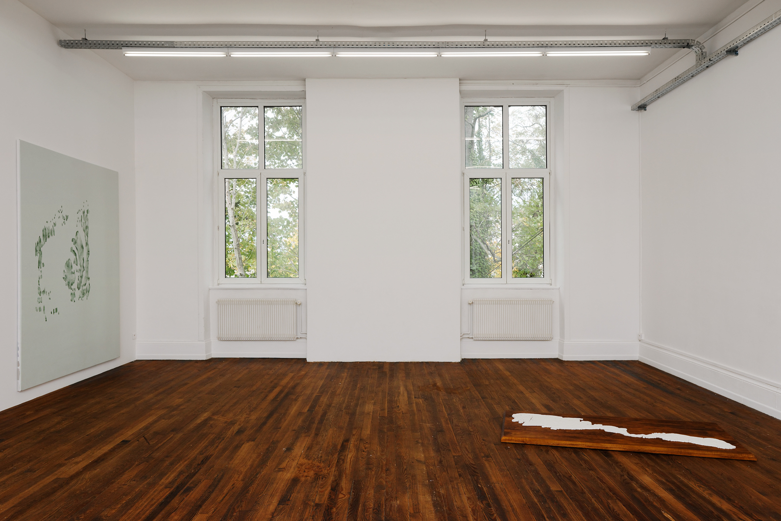 Et évidemment le glacier. En plus de la série de quatre dessins View of Grosser Aletschgletscher (2013), dans laquelle différentes tonalités de blancs, de bruns et de noirs offrent des vues distinctes dudit glacier, plusieurs séries représentant des fragments de différents glaciers se déploient dans l’espace, répartissant et situant divers points géographiques alpins dans les différentes salles. Dans l’espace central au 1er étage du CRAC, Gornergletscher from On Top (2014), une installation de 28 dessins, montre le glacier dans sa totalité à travers différents fragments dessinés et les vides entre eux. Pendant dix jours, l’artiste dessine les zones du glacier présentant la plus grande variété de formes et de textures, laissant de côté les endroits où la surface de la glace est lisse. Elle établit ainsi une méthodologie arbitraire qui lui permet d’appréhender et de délimiter le paysage. Cette pièce sert à réaliser la nouvelle série de sculptures en céramique. Superposant la forme du glacier avec le plan au sol du CRAC, nous avons sélectionné quelques-uns des dessins qui, matérialisés désormais en volume, sont disséminés à travers les différentes salles, posés au sol à chaque point de convergence.