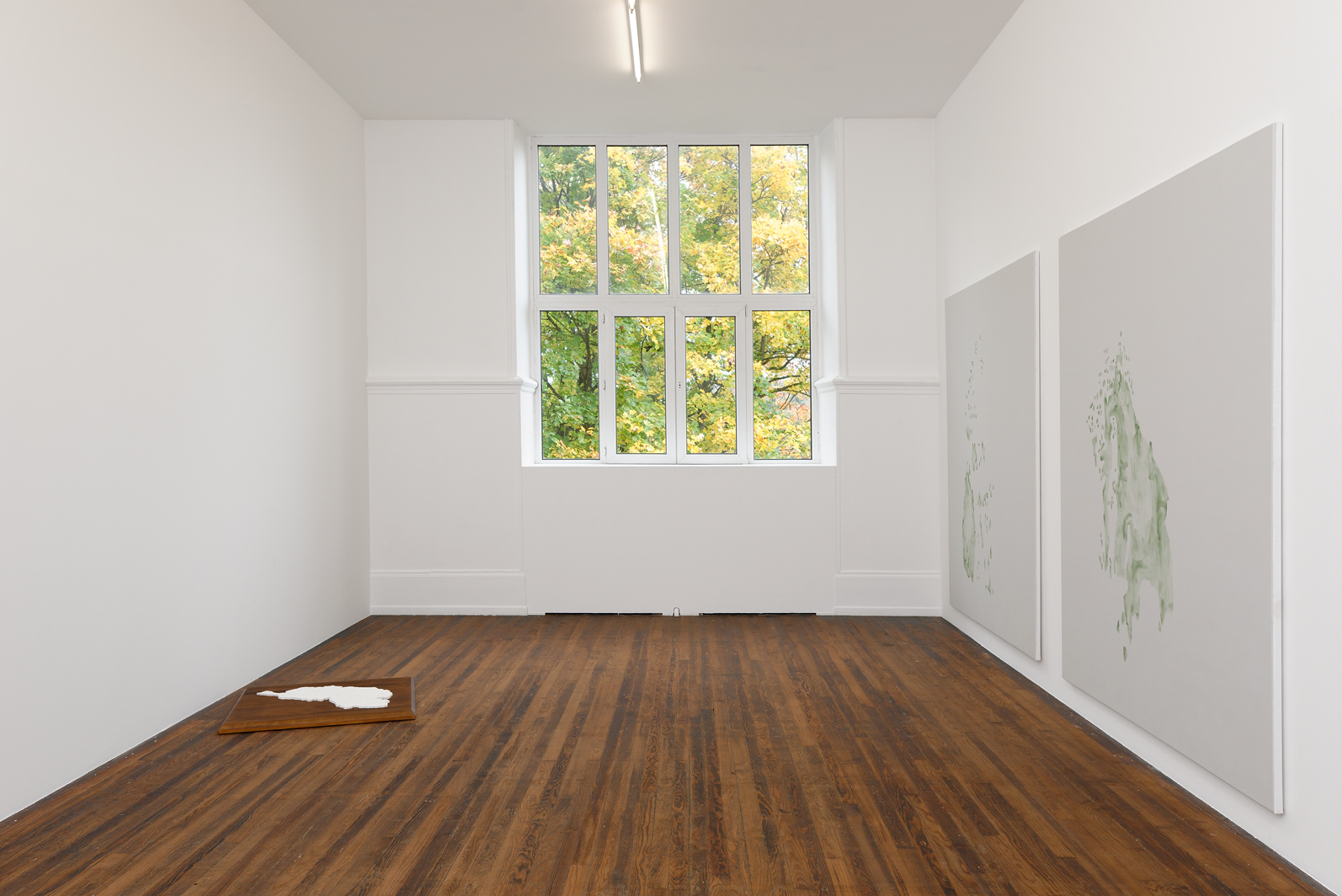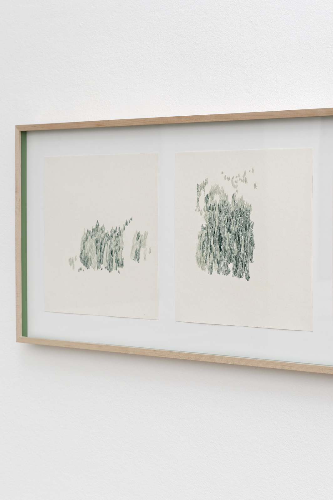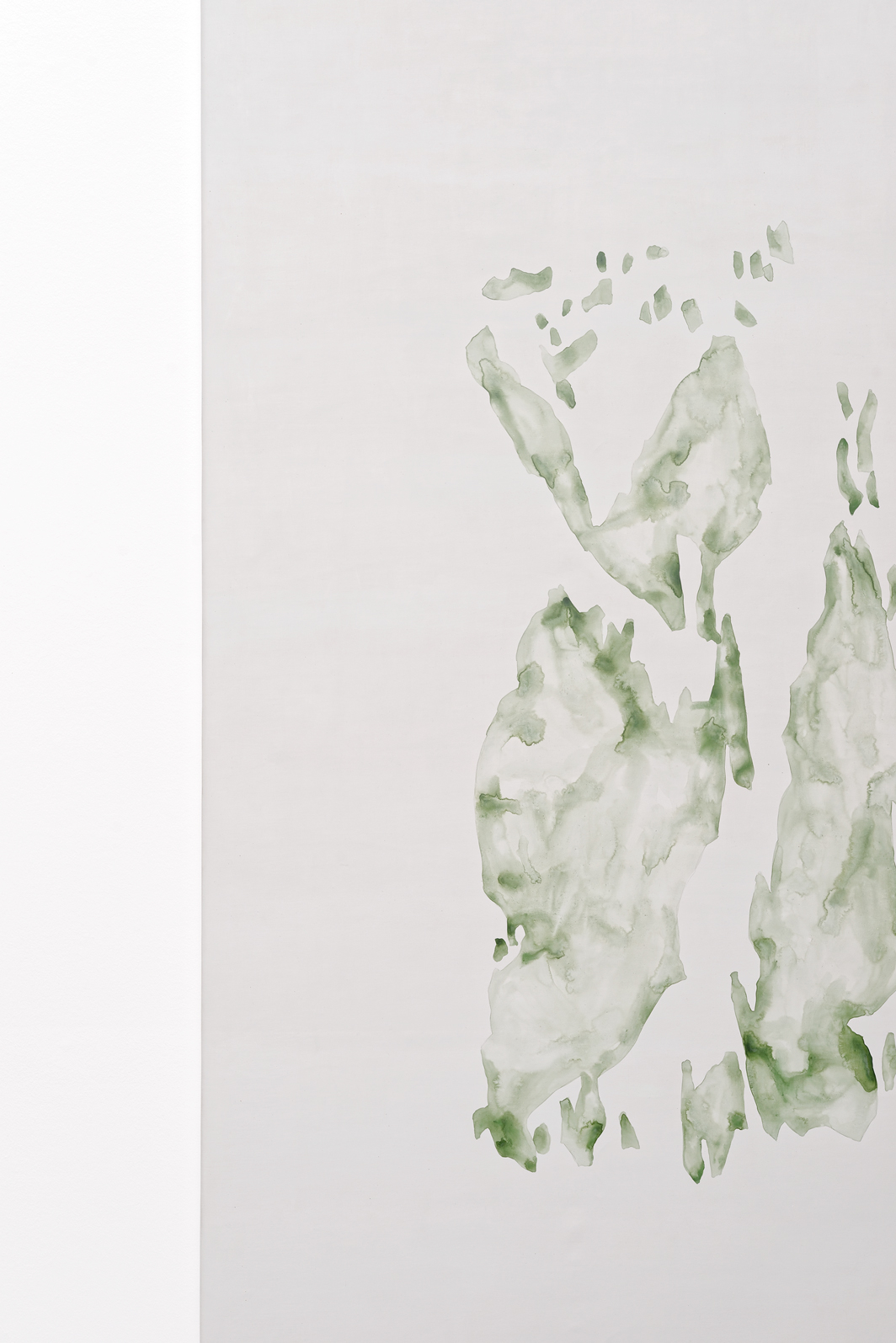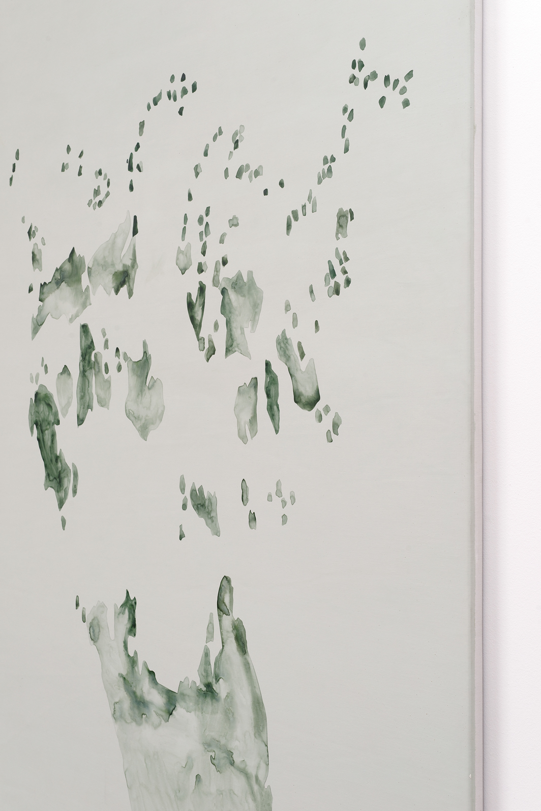 Le CRAC Alsace occupe une ancienne école, un lieu conçu à ses débuts comme espace d’apprentissage pour découvrir le monde. Ses nombreuses salles de différentes tailles fonctionnent parfaitement pour articuler ces images issues des proches montagnes suisses, soulignant le caractère fragmentaire des dessins et de leur processus de production. Les éléments essentiels du projet, comme le titre l’indique justement, portent sur les glaciers et les flancs de montagnes dont les arbres nous indiquent l’action des avalanches. Le nombre de dessins de chaque série est en effet défini par le nombre de jours d’ascension de chaque expédition, qui peuvent être plus ou moins longs avec des conditions climatiques et une visibilité changeantes. Si ces éléments conditionnent le volume de travail, ils se traduisent en outre dans l’installation des œuvres qui se répartissent dans l’espace sans ordre chronologique, mais selon une orientation spatiale et conceptuelle. Accrochées dans les deux salles latérales, de part et d’autre du périmètre de présentation, quatre peintures de la série Tree Lines (2015) embrassent l’exposition. Ce sont les vues sur deux versants opposés, où Kopelman saisit l’effet des avalanches à travers la représentation de deux types d’arbres qui peuplent le secteur à cette altitude. Quatre jours pour peindre une pente, quatre jours pour peindre l’autre. Ce jeu de versants opposés apparaît aussi dans Tree Lines Davos, Two Slopes from On Top (2013) et Tree Lines Davos, Two Slopes from Below (2014), réalisées respectivement à l’aquarelle et au crayon de couleur et qui représentent, depuis le haut et le bas, ces masses d’arbres qui informent la température du territoire et l’action des avalanches. Dans la seconde peinture, la tentative de différencier les deux espèces d’arbres grâce aux différentes teintes de vert est particulièrement perceptible. Lichens from Fluhalp (2014) est une autre série de huit dessins que l’artiste réalise quand les conditions météorologiques l’empêchent de peindre le glacier. Elle décide alors de se concentrer sur des motifs de la nature à une autre échelle, par exemple des lichens sur les roches, qui ressemblent curieusement à ceux du glacier. Ces organismes, couvrant de grandes superficies de terrain, passent souvent inaperçus si l’on n’y prête pas attention et servent à mesurer la pollution de l’air. Plus l’air est pur, plus ils s’étendent, surtout dans des zones rocheuses où d’autres espèces ne peuvent pas vivre, absorbant d’énormes quantités d’azote et de dioxyde de carbone qu’ils contribuent à fixer dans le sol.