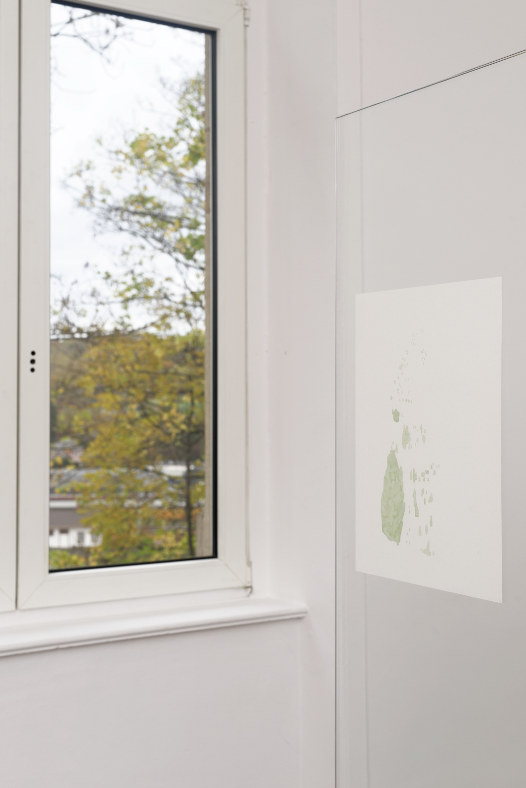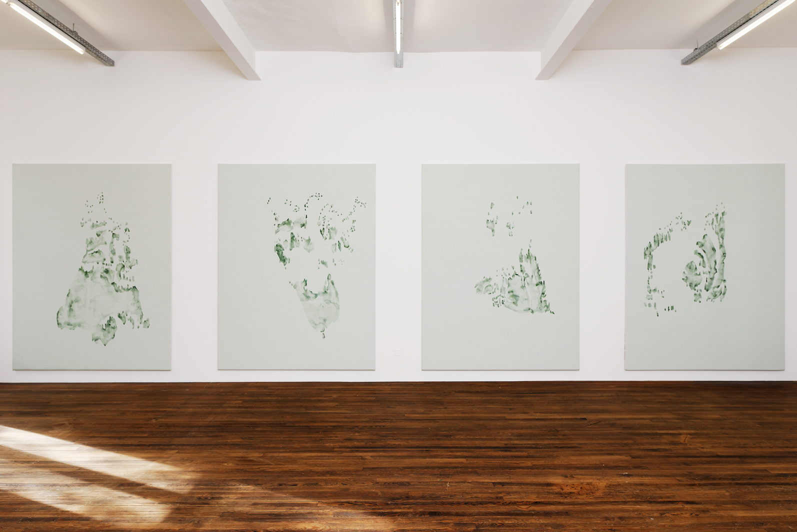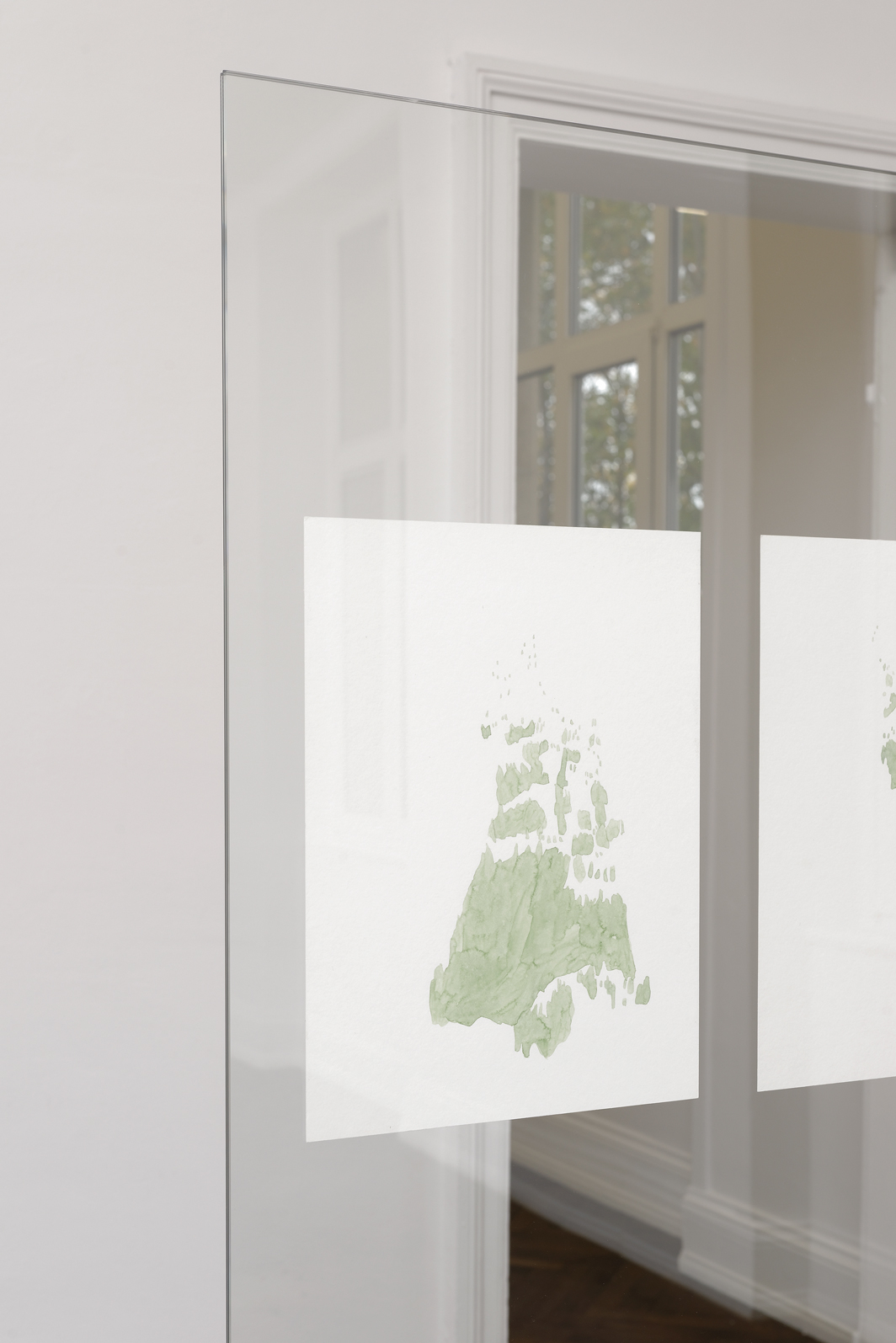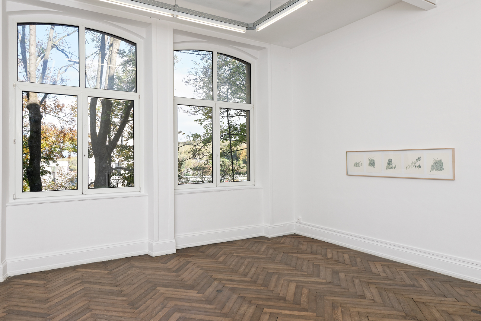 Le CRAC Alsace occupe une ancienne école, un lieu conçu à ses débuts comme espace d’apprentissage pour découvrir le monde. Ses nombreuses salles de différentes tailles fonctionnent parfaitement pour articuler ces images issues des proches montagnes suisses, soulignant le caractère fragmentaire des dessins et de leur processus de production. Les éléments essentiels du projet, comme le titre l’indique justement, portent sur les glaciers et les flancs de montagnes dont les arbres nous indiquent l’action des avalanches. Le nombre de dessins de chaque série est en effet défini par le nombre de jours d’ascension de chaque expédition, qui peuvent être plus ou moins longs avec des conditions climatiques et une visibilité changeantes. Si ces éléments conditionnent le volume de travail, ils se traduisent en outre dans l’installation des œuvres qui se répartissent dans l’espace sans ordre chronologique, mais selon une orientation spatiale et conceptuelle. Accrochées dans les deux salles latérales, de part et d’autre du périmètre de présentation, quatre peintures de la série Tree Lines (2015) embrassent l’exposition. Ce sont les vues sur deux versants opposés, où Kopelman saisit l’effet des avalanches à travers la représentation de deux types d’arbres qui peuplent le secteur à cette altitude. Quatre jours pour peindre une pente, quatre jours pour peindre l’autre. Ce jeu de versants opposés apparaît aussi dans Tree Lines Davos, Two Slopes from On Top (2013) et Tree Lines Davos, Two Slopes from Below (2014), réalisées respectivement à l’aquarelle et au crayon de couleur et qui représentent, depuis le haut et le bas, ces masses d’arbres qui informent la température du territoire et l’action des avalanches. Dans la seconde peinture, la tentative de différencier les deux espèces d’arbres grâce aux différentes teintes de vert est particulièrement perceptible. Lichens from Fluhalp (2014) est une autre série de huit dessins que l’artiste réalise quand les conditions météorologiques l’empêchent de peindre le glacier. Elle décide alors de se concentrer sur des motifs de la nature à une autre échelle, par exemple des lichens sur les roches, qui ressemblent curieusement à ceux du glacier. Ces organismes, couvrant de grandes superficies de terrain, passent souvent inaperçus si l’on n’y prête pas attention et servent à mesurer la pollution de l’air. Plus l’air est pur, plus ils s’étendent, surtout dans des zones rocheuses où d’autres espèces ne peuvent pas vivre, absorbant d’énormes quantités d’azote et de dioxyde de carbone qu’ils contribuent à fixer dans le sol.