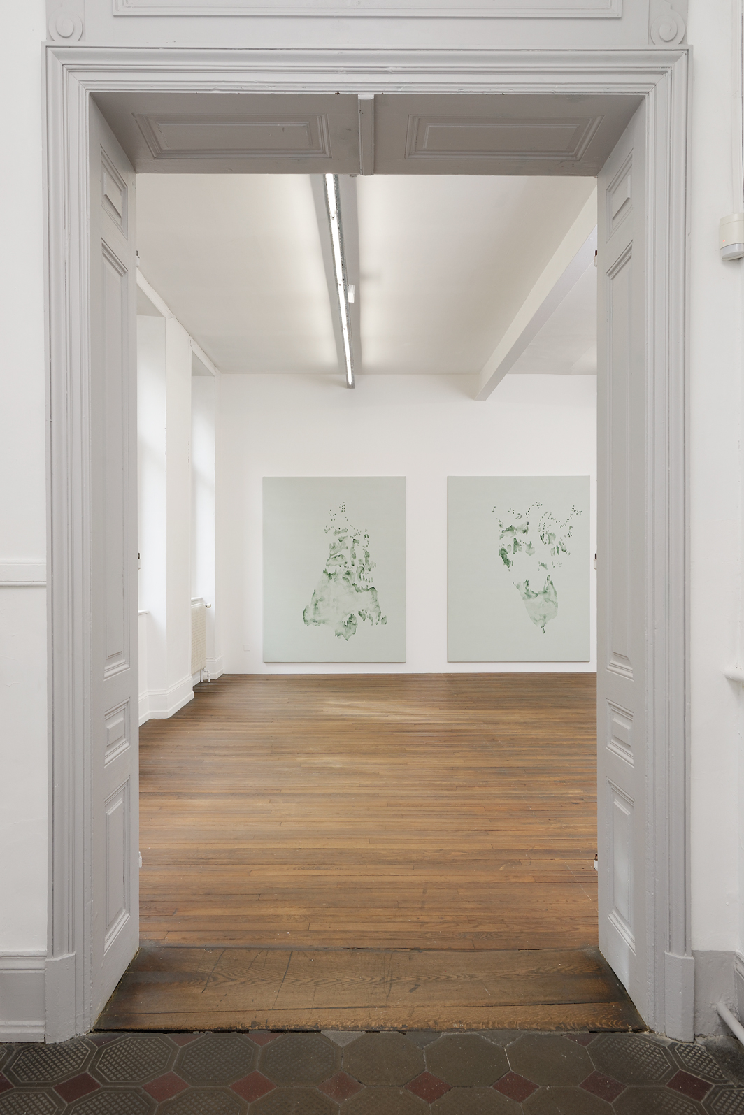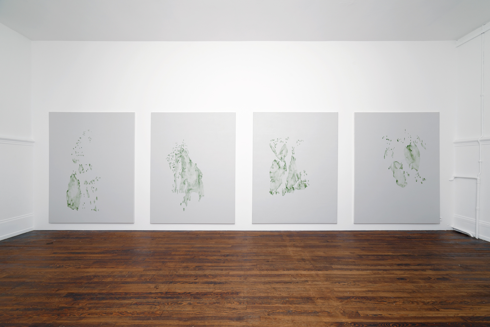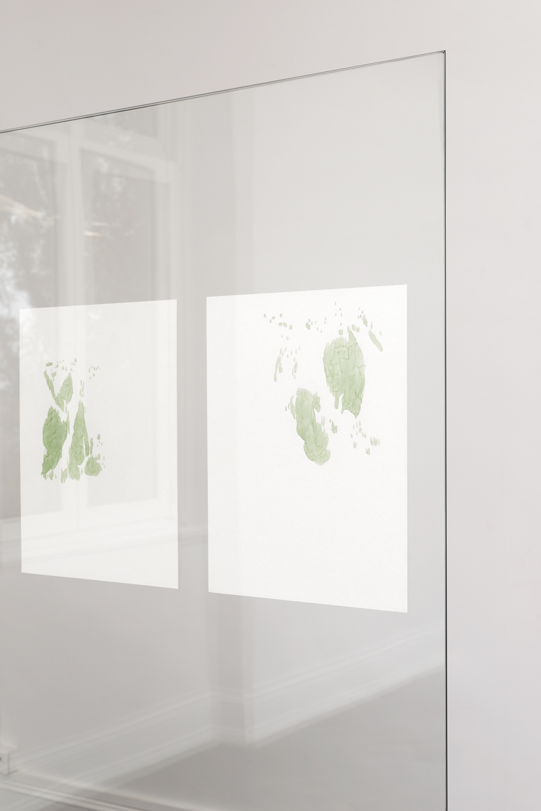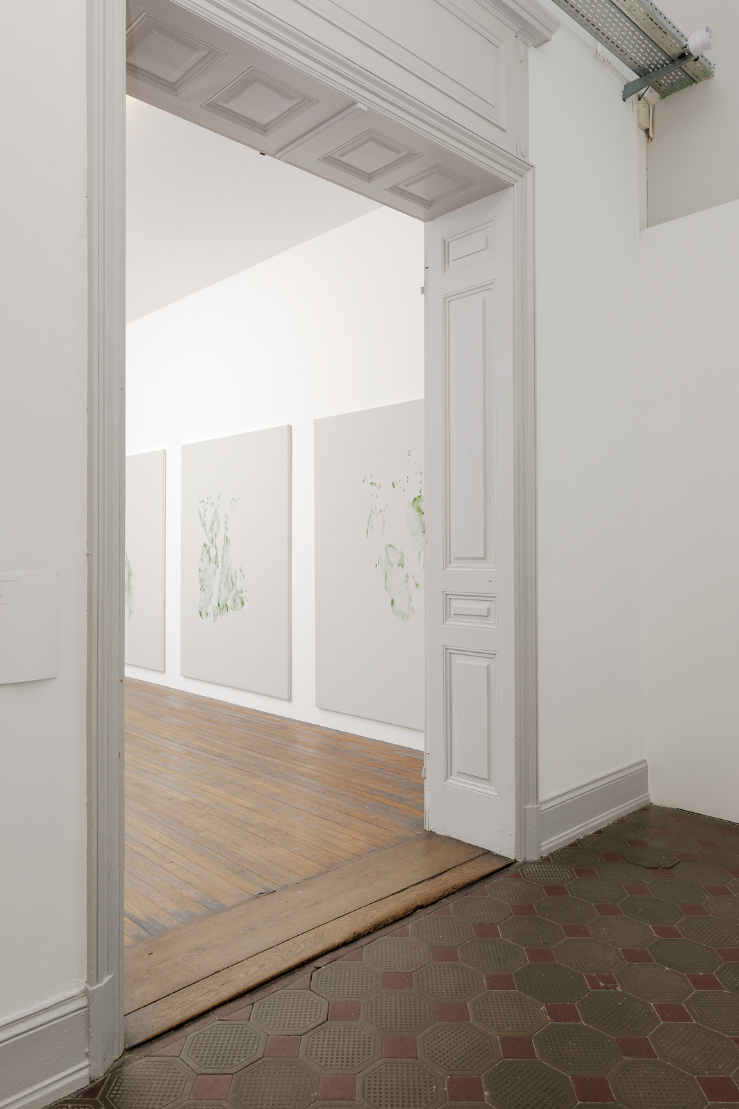 Le CRAC Alsace occupe une ancienne école, un lieu conçu à ses débuts comme espace d’apprentissage pour découvrir le monde. Ses nombreuses salles de différentes tailles fonctionnent parfaitement pour articuler ces images issues des proches montagnes suisses, soulignant le caractère fragmentaire des dessins et de leur processus de production. Les éléments essentiels du projet, comme le titre l’indique justement, portent sur les glaciers et les flancs de montagnes dont les arbres nous indiquent l’action des avalanches. Le nombre de dessins de chaque série est en effet défini par le nombre de jours d’ascension de chaque expédition, qui peuvent être plus ou moins longs avec des conditions climatiques et une visibilité changeantes. Si ces éléments conditionnent le volume de travail, ils se traduisent en outre dans l’installation des œuvres qui se répartissent dans l’espace sans ordre chronologique, mais selon une orientation spatiale et conceptuelle. Accrochées dans les deux salles latérales, de part et d’autre du périmètre de présentation, quatre peintures de la série Tree Lines (2015) embrassent l’exposition. Ce sont les vues sur deux versants opposés, où Kopelman saisit l’effet des avalanches à travers la représentation de deux types d’arbres qui peuplent le secteur à cette altitude. Quatre jours pour peindre une pente, quatre jours pour peindre l’autre. Ce jeu de versants opposés apparaît aussi dans Tree Lines Davos, Two Slopes from On Top (2013) et Tree Lines Davos, Two Slopes from Below (2014), réalisées respectivement à l’aquarelle et au crayon de couleur et qui représentent, depuis le haut et le bas, ces masses d’arbres qui informent la température du territoire et l’action des avalanches. Dans la seconde peinture, la tentative de différencier les deux espèces d’arbres grâce aux différentes teintes de vert est particulièrement perceptible. Lichens from Fluhalp (2014) est une autre série de huit dessins que l’artiste réalise quand les conditions météorologiques l’empêchent de peindre le glacier. Elle décide alors de se concentrer sur des motifs de la nature à une autre échelle, par exemple des lichens sur les roches, qui ressemblent curieusement à ceux du glacier. Ces organismes, couvrant de grandes superficies de terrain, passent souvent inaperçus si l’on n’y prête pas attention et servent à mesurer la pollution de l’air. Plus l’air est pur, plus ils s’étendent, surtout dans des zones rocheuses où d’autres espèces ne peuvent pas vivre, absorbant d’énormes quantités d’azote et de dioxyde de carbone qu’ils contribuent à fixer dans le sol.