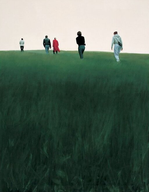 The most well-known in the group is young German artist Tim Eitel. This 33-year-old achieved celebrity soon after graduation from the Hochschule fur Grafik und Buchkunst in Leipzig with his realistic oil paintings incorporating elements from the Romantics. CRAC Alsace shows a small selection of his paintings that depict the internal urban space: views of museums and galleries, generally depicted as aseptic white cubes. Eitel creates extremely sparse spaces that are highly abstract. He then inserts figures: young, successful and fashionable ones who emanate a feeling of unease within these aseptic landscapes, creating an effect that is simultaneously realistic and surreal. This eerie juxtaposition is continued in his work "Natur" (Nature). In spite of its name, the nature of the work is in keeping with the urban theme of the installation. Eitel's landscape does little to evoke classical ideas of nature—it is neither a wilderness nor an idyll. It merely serves as a frame that is implied through elements such as the hint of avenues of trees in the background. The dominant color is green, but it is a matte, monochrome tone that remains neutral. Eitel's nature is neither nurturing nor provocative. Portraits range from the stark and pathetic to finely interwoven psychological group portraits such as "Ausflug" (excursion/trip), a work completed last year, which depicts a sort of snapshot of a circle of friends or colleagues. It is less a testimony to their nature as a group than their ultimate isolation from each other: each member of the group seems to be an isolated unit, leaving us with the tacit conviction of a seemingly existing social link that is ultimately superficial.