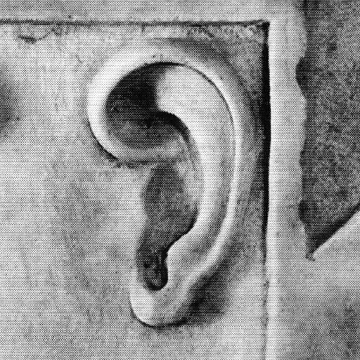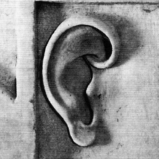 Alors que les titres de cette exposition se succédaient, à la recherche que nous étions d’une formule qui ne fixe rien, d’un titre phénomène, volatile, d’une humeur, d’un titre qui ni ne décrit, ni n’indique ses intentions, d’un titre qui laisse toute sa place à l’expérience nue de l’exposition, Elena se mit à avoir une peur bleu clair que les choses ne se touchent jamais et Hagar une peur floue et verte de ne plus voir l’exposition. Voyant qu’on ne s’entendait plus, je leur envoyai l’image d’une offrande, celle qu’un certain Cutius donna à Asklêpiós pour le remercier d’avoir soigné sa surdité, un petit bas-relief de format carré laissant affleurer une architecture géométrique qui encadre deux oreilles sculptées dans le marbre, probablement celles de Cutius. Deux oreilles qui se font face, et qui, non seulement entendent, mais aussi parlent. Deux oreilles qui disent merci.