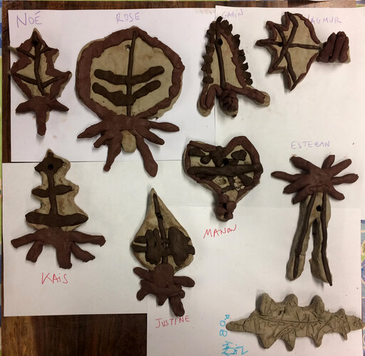 L’idée était d’aborder la plante médicinale comme un personnage vivant, dans une histoire construite à partir de ce qu’elles·ils connaissaient et non du jardin créole. Le fait de ramener des plantes de chez soi permettait d’engager leur curiosité à partir de leur environnement. Une fois ensemble, j’ai commencé par demander aux plus grand·e·s ce qu’elles·ils savaient de ces plantes, et si elles·ils pouvaient me donner leurs propriétés puis après une session de toucher, d’observation, d’olfaction avec les plantes amenées, nous avons regardé une courte vidéo sur une expérimentation dans une école dans laquelle on compare la croissance de deux plantes, une qui reçoit des compliments, et l’autre des injures. Nous avons discuté des émotions pour ensuite commencer à construire de petites narrations impliquant une plante, un personnage, une émotion et un lieu. Je leur ai montré des dessins d’herbiers du Moyen-Âge, ainsi que quelques symboles d'éléments de la nature comme l’eau ou le feu avant de passer à une session d’écriture de leurs histoires puis de modelage. Pour les plus petit·e·s, nous avons aussi discuté des émotions, fait une courte méditation active en prenant l’image de la croissance d'un arbre depuis la germination de la graine, mais c’est directement en modelant qu’elles·ils ont composé leurs histoires.